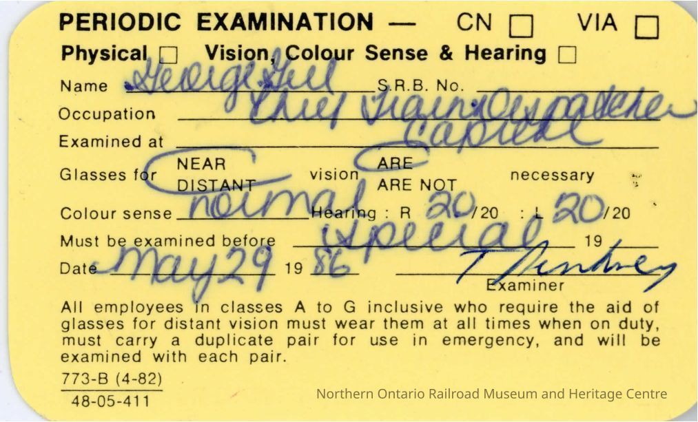 Canadian National branded periodic examination card. This card was distributed to Canadian National workers to record their physical, vision, and hearing examinations. This particular card was given to George Gill, a Chief Train Dispatcher. Gill was having his eyes examined and it was determined that he needed glasses, he is near sited and his glasses are required. He was examined in Capreol in May 29th, 1986.