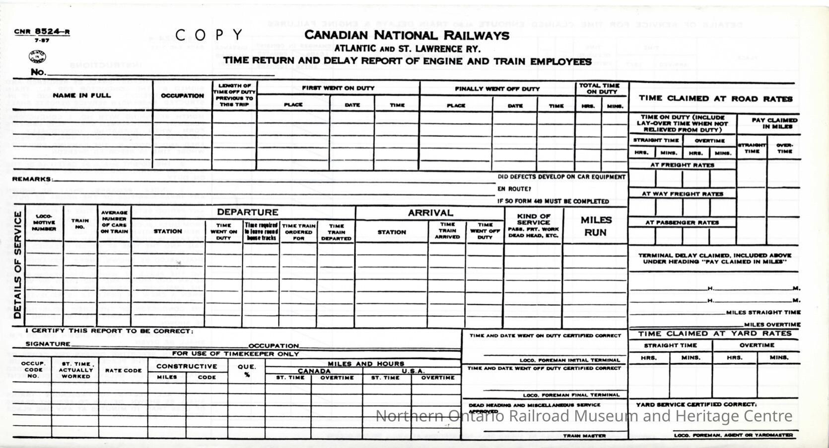 Document, Canadian National Railways, Atlantic and St Lawrence Railway, Time Return and Delay Report of Engine and Train Employees, CNR 8524-R, Blank.Collection