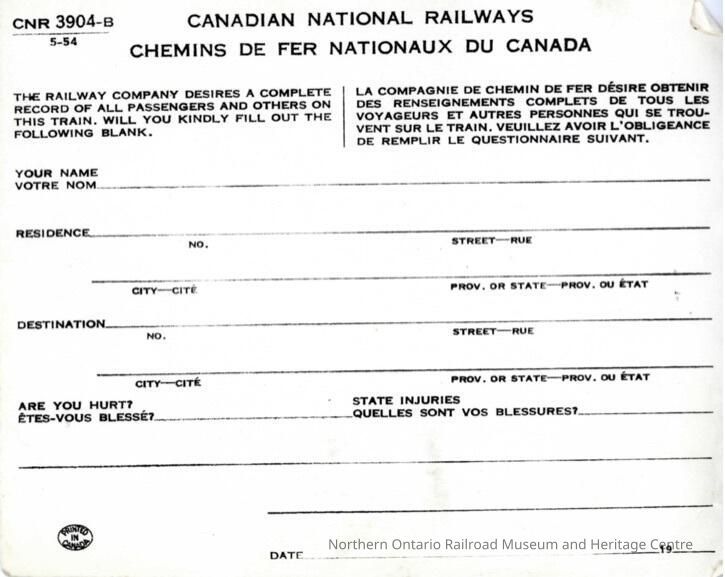 Document, Canadian National Railways Passenger Record Form, CNR 3904-B, Blank.Collection