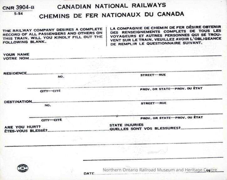 Document, Canadian National Railways Passenger Record Form, CNR 3904-B, Blank.Collection