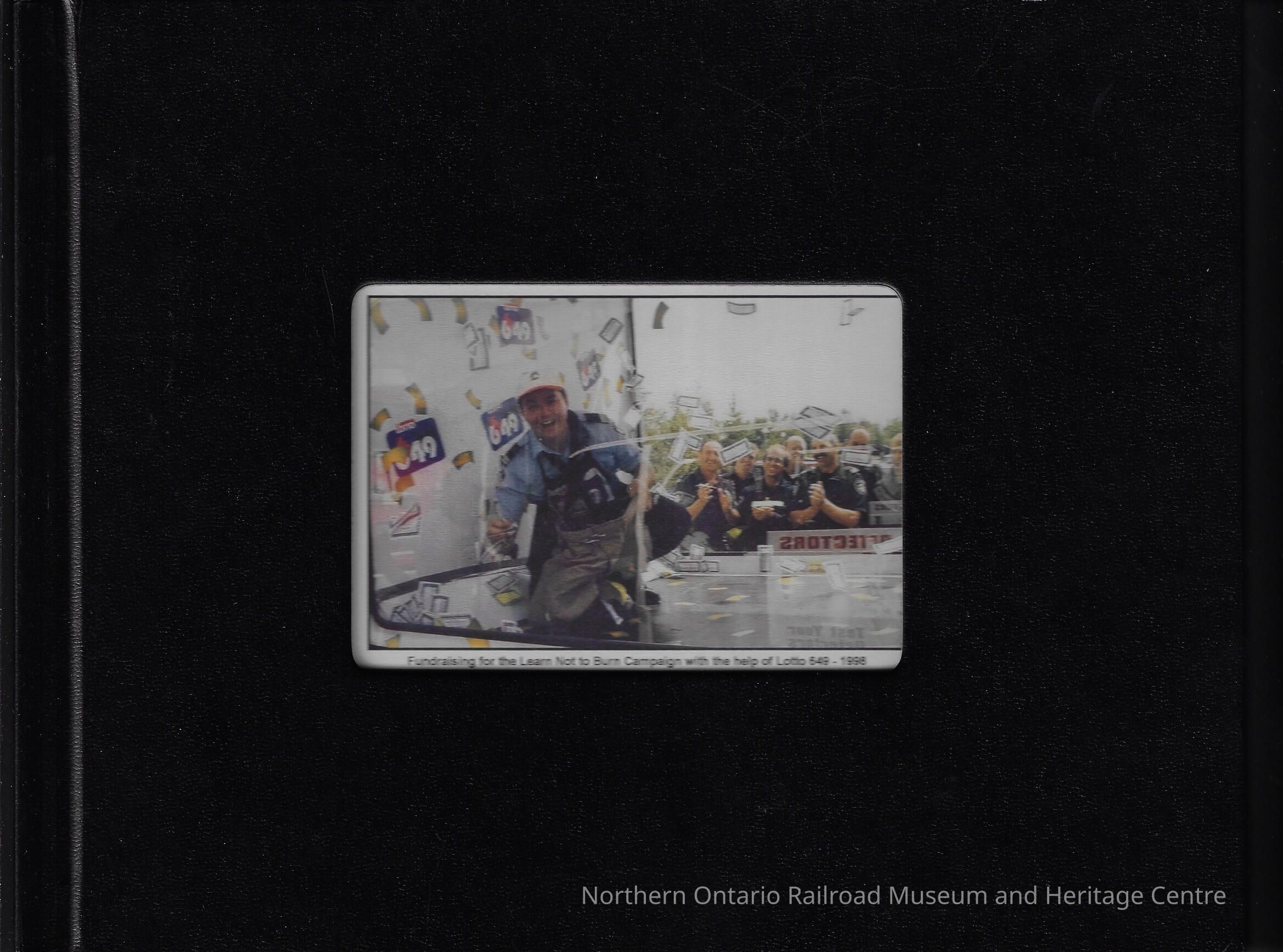 Photograph album containing photographs of the Greater Sudbury Fire Service (fire department). The photos appear to have been taken circa 1990s-2001. It includes a variety of photos capturing events and people including: firefighters, fundraising events, safety campaigns, offices, plaques, awards, chiefs, community involvement, and more.