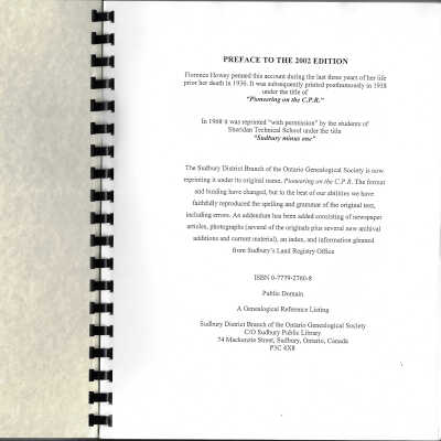 Written by Florence Howey before her death in 1936, it was printed posthumously in 1938 as "Pioneering the C. P. R.", then published as "Sudbury Minus One" in 1968 by the students of Sheridan Technical School. In 2002 it was reprinted by the Sudbury Branch of the Ontario Genealogical Society.