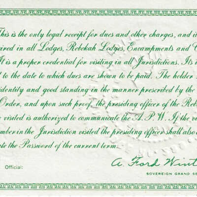 Official certificate for payment of dues for the Independent Order of Odd Fellows.Context