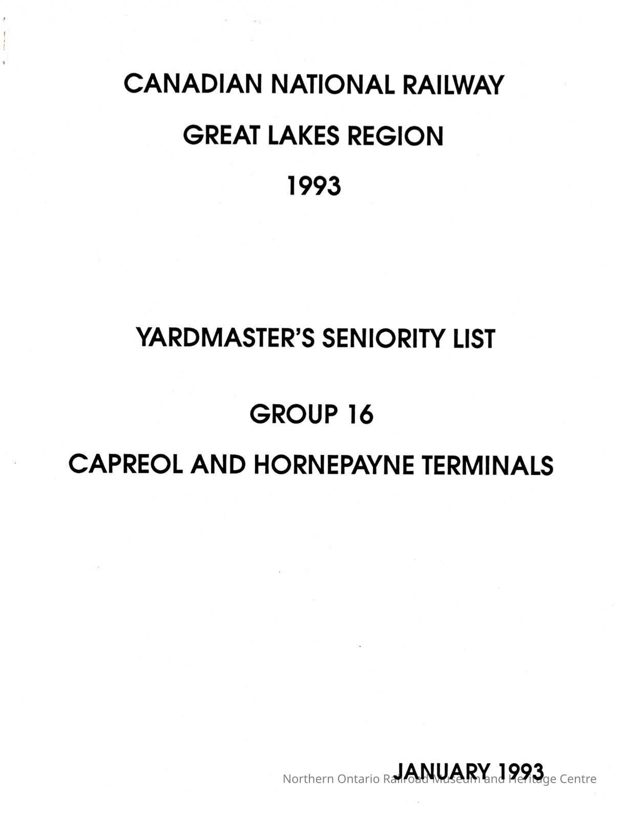 Document, Canadian National Railway, Great Lakes Region, 1993, Yardmaster's Seniority List, Group 16, Capreol and Hornepayne Terminals, January 1993.Collection