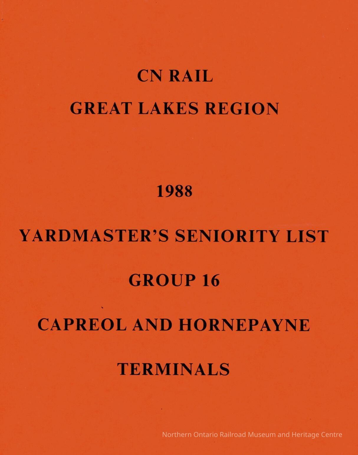Document, CN Rail, Great Lakes Region, 1988 Yardmaster's Seniority List, Group 16, Capreol and Hornepayne Terminals.Collection