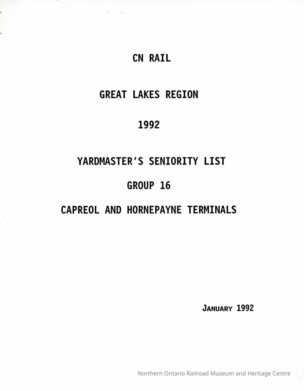 Document, CN Rail, Great Lakes Region, 1992, Yardmaster's Seniority List, Group 16, Capreol and Hornepayne Terminals, January 1992.Collection