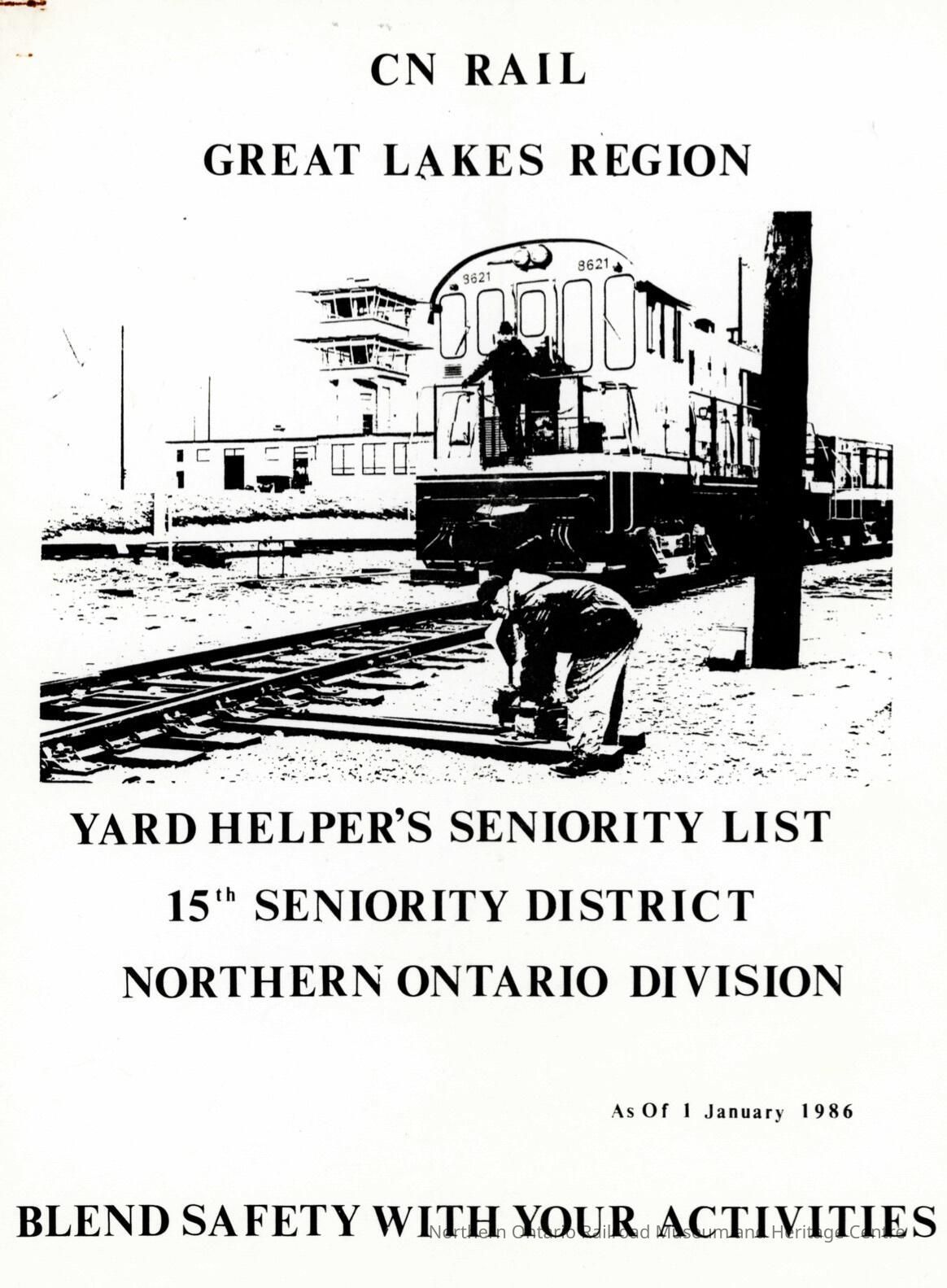 Document,CN Rail, Great Lakes Region, Yard Helper's Seniority List, 15th Seniority District, Northern Ontario Division, January 1986.Collection