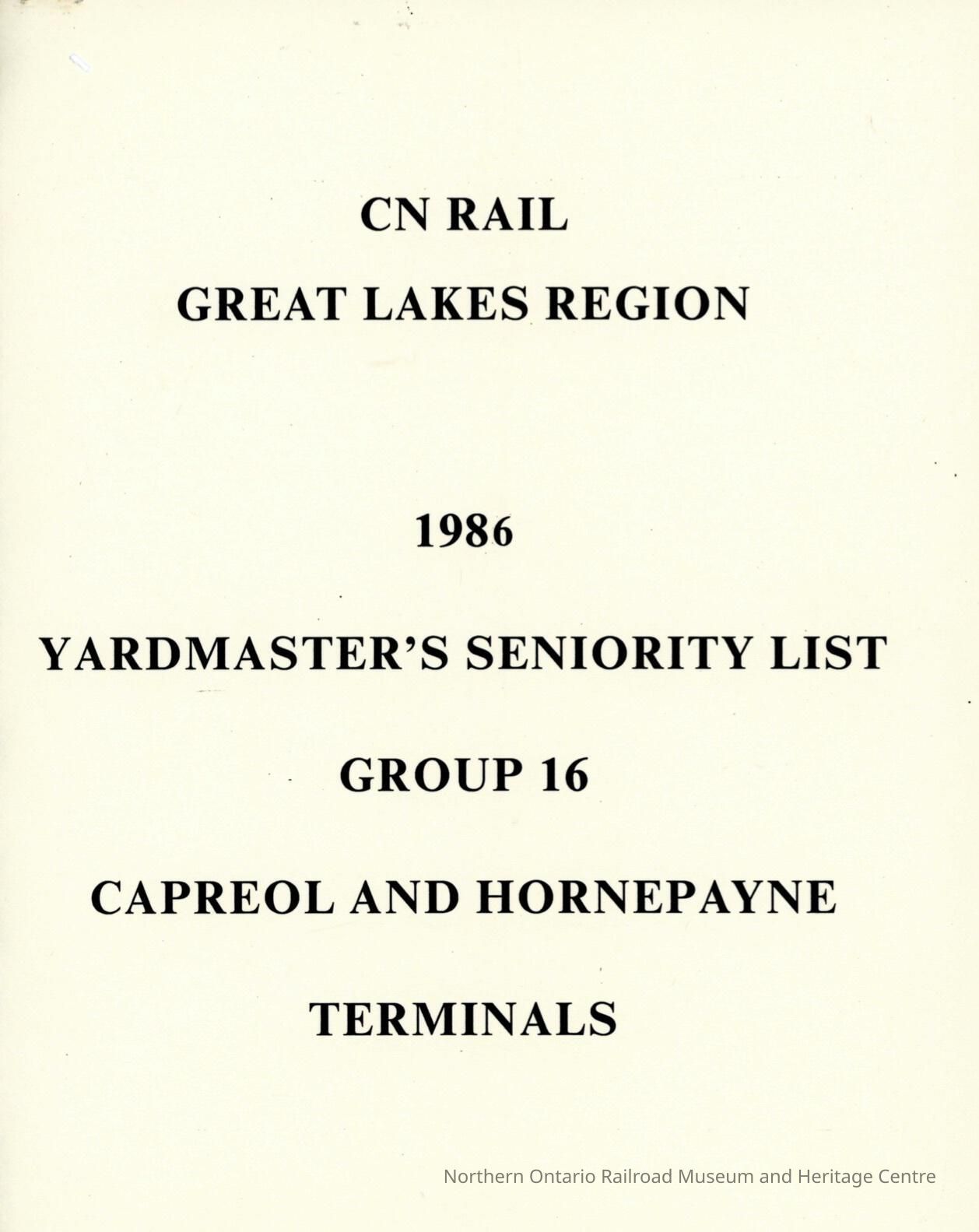 Document, CN Rail, Great Lakes Region, 1986, Yardmaster's Seniority List, Group 16, Capreol and Hornepayne Terminals.Collection