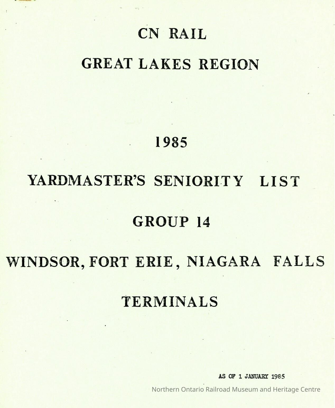 Document, CN Rail, Great Lakes Region, 1985, Yardmaster's Seniority List, Group 14, Windsor, Fort Erie, Niagara Falls Terminals.Collection
