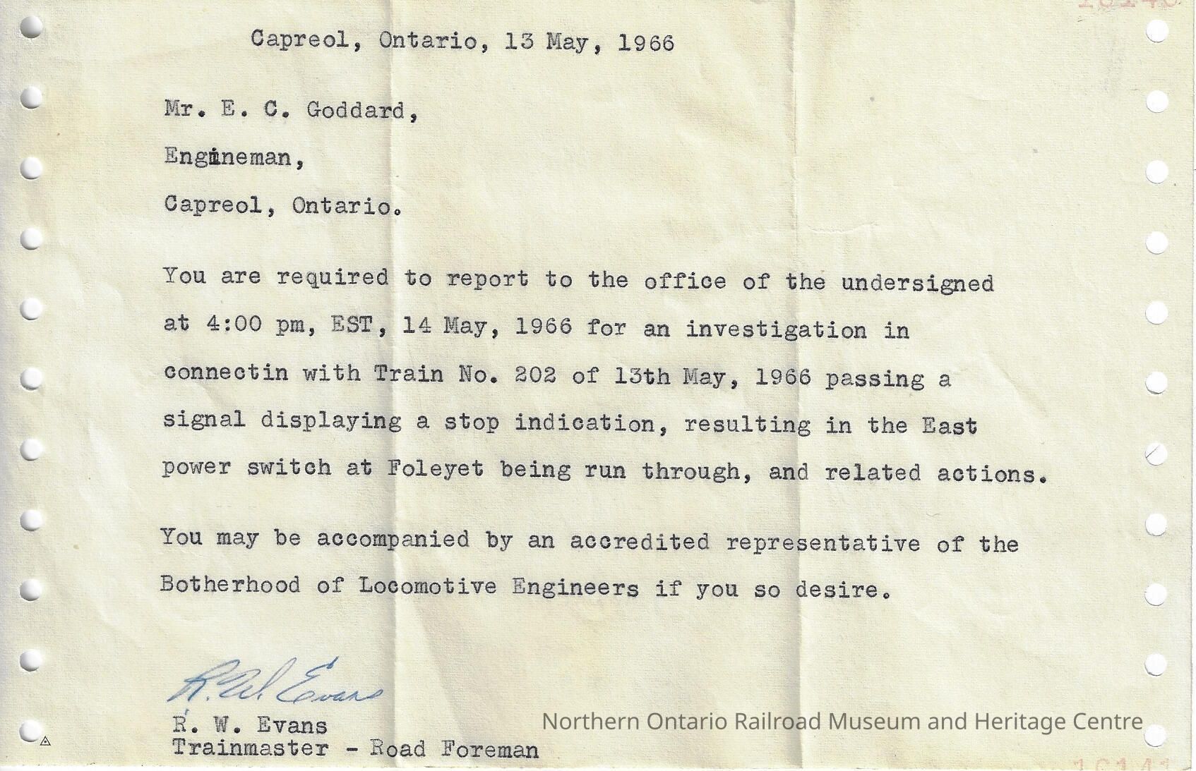 A letter addressed to Mr. E. C. Goddard, sent from R. W. Evans, a Trainmaster and Road Foreman. The letter is advising Goddard that he is required to attend an investigation at the office of R. W. Evans at 4:00pm on May 14th, 1966. The investigation has to do with Train No. 202 on May 13th, 1966 because it passed a signal displaying a stop indication, the result of which caused the east power switch at Foleyet to be run through.Context
