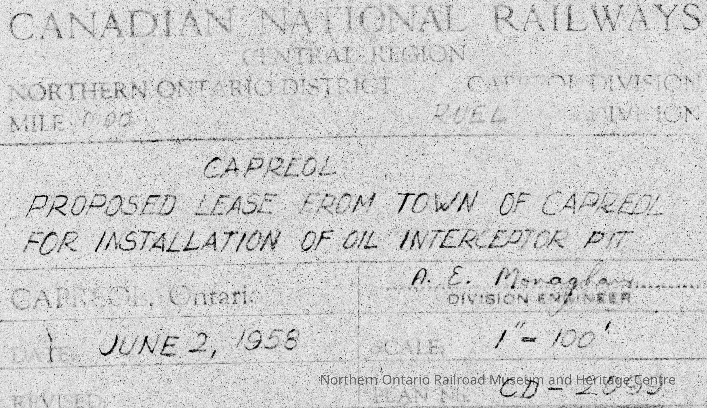 Canadian National branded plan showing the proposed lease from the Town of Capreol for the installation of oil interceptor pit at mile 0.00, Capreol. The area is part of the Capreol Division of Canadian National's Central Region, Northern Ontario DistrictCreator