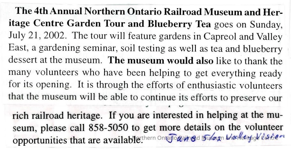 "4th Annual NOMRHC Garden Tour and Blueberry Tea" in Valley Vision, 5 June 2002. Details for event and contact info.Collection