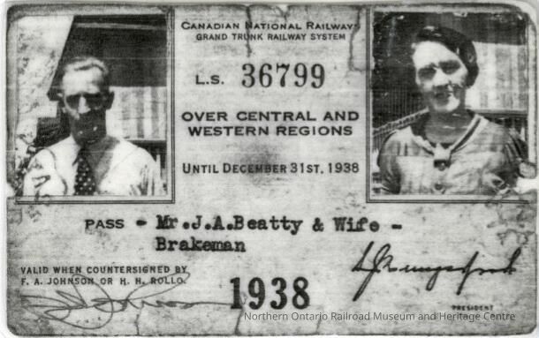 Canadian National branded central and western regions pass assigned to A. J. Beatty and his wife in 1938. Beatty was working as a brakeman at the time and was awarded the pass for having 15 years service with the company. The pass allowed the two to travel on any passenger trains on the CNR's central and western regions lines.
