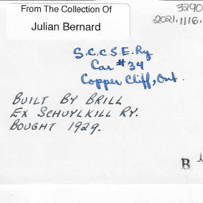 Car #34 was purchased in 1929 by the Sudbury Copper Cliff Suburban Electric Railway. It was built by Brill and originally used by the Schuylkill Railway.Collection