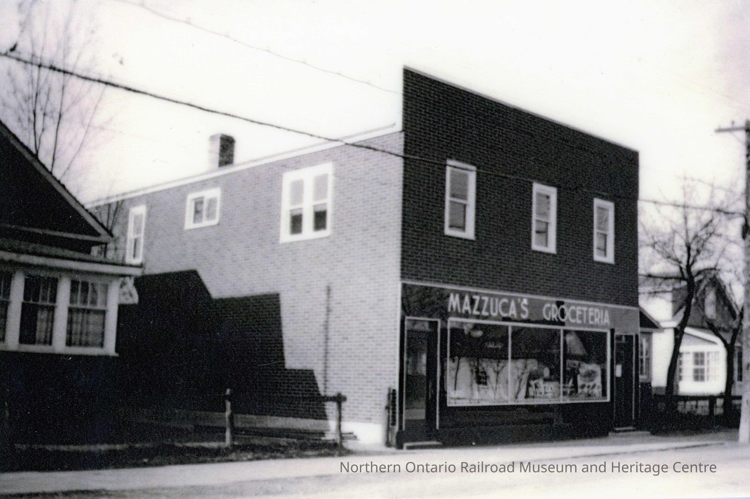 Black and white photograph of Mazzuca's Groceteria in the 1950s. Owner Fiore Mazzuca.Collection