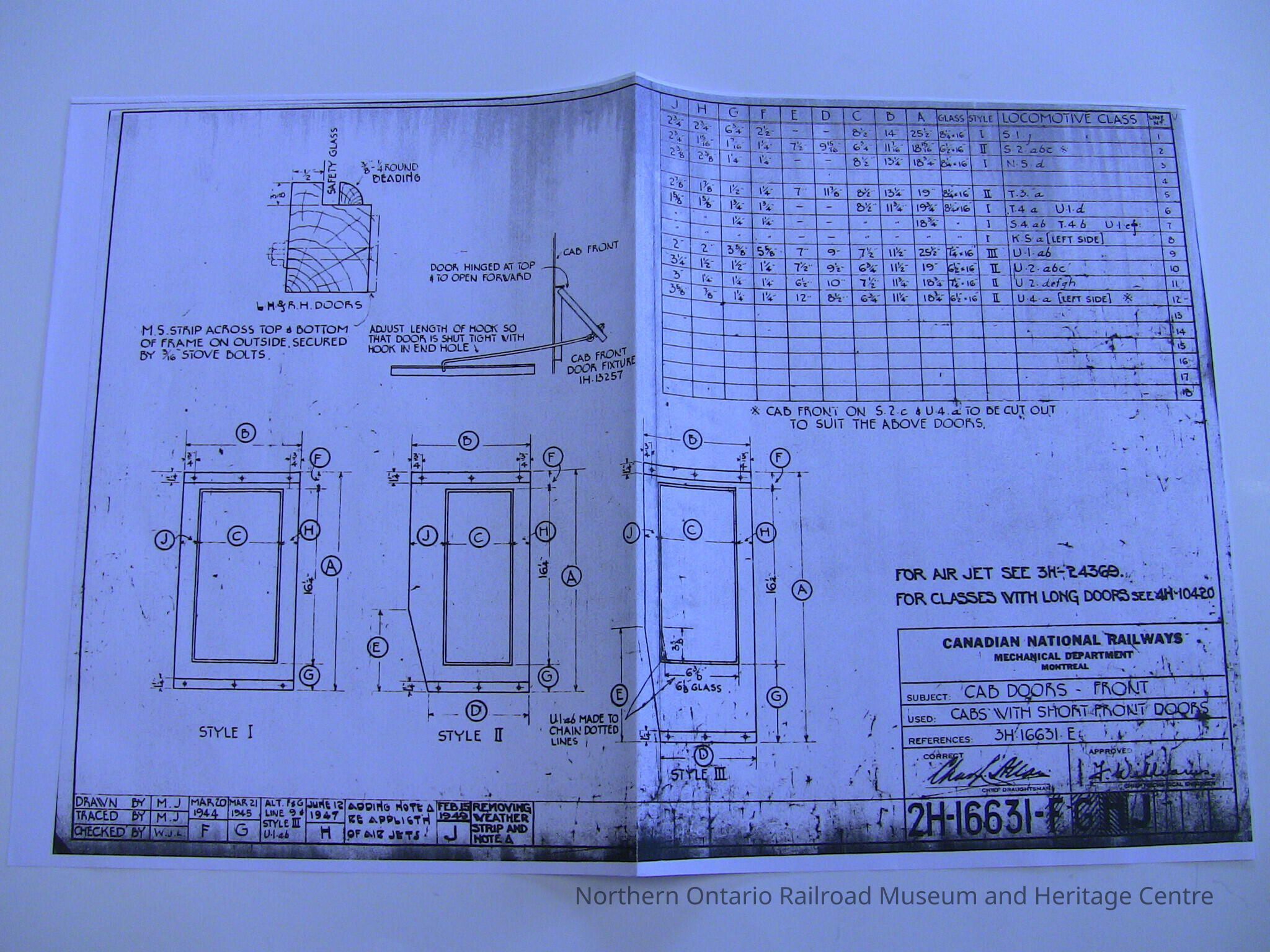 A reproduction of technical drawings drawn at the Canadian National Mechanical Department in Montreal of the front cab doors of Engine no. 6077.Collection