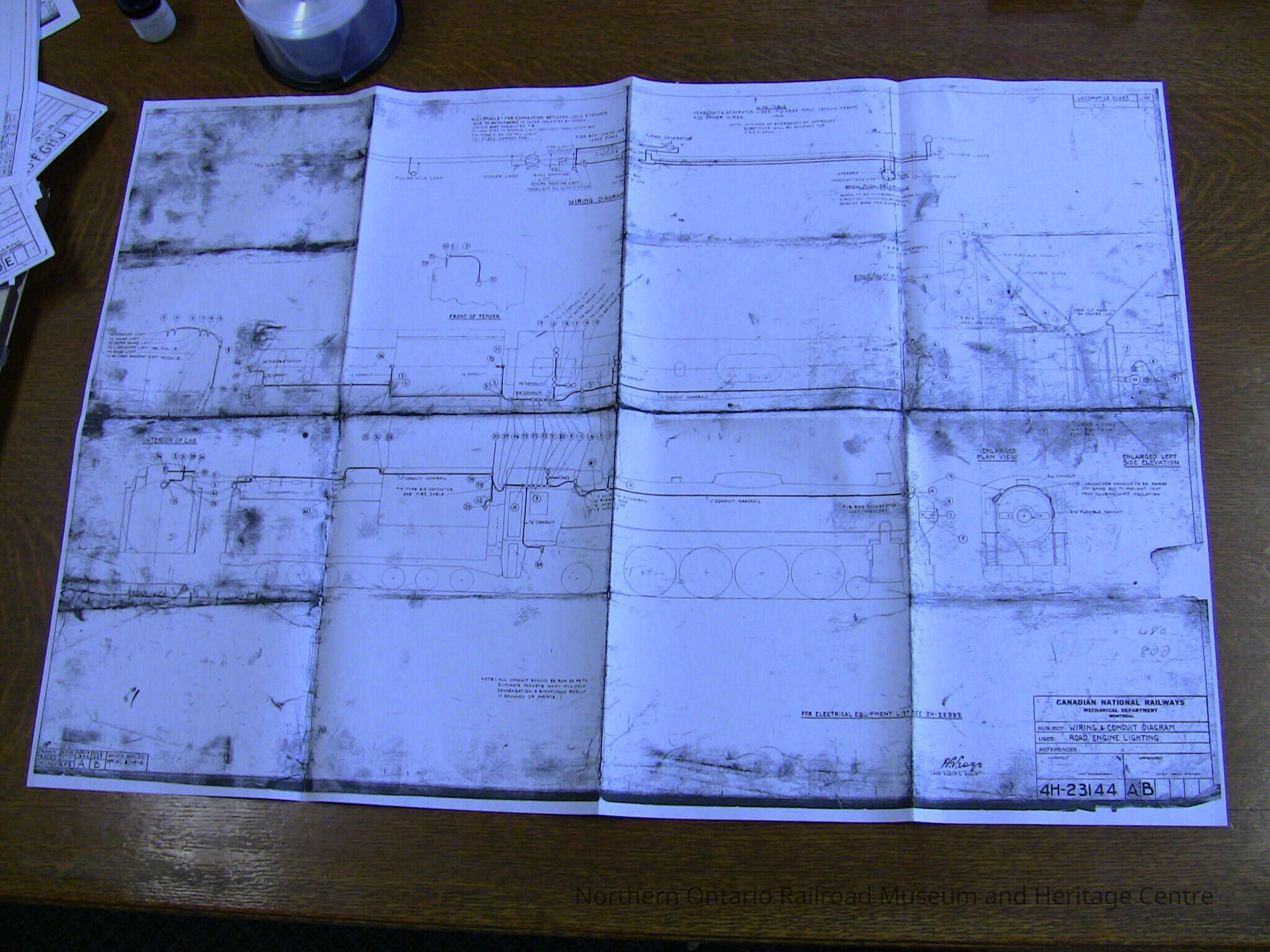 A reproduction of technical drawings drawn at the Canadian National Mechanical Department in Montreal of the wiring and conduit system used for the road engine lighting of Engine no. 6077.Collection