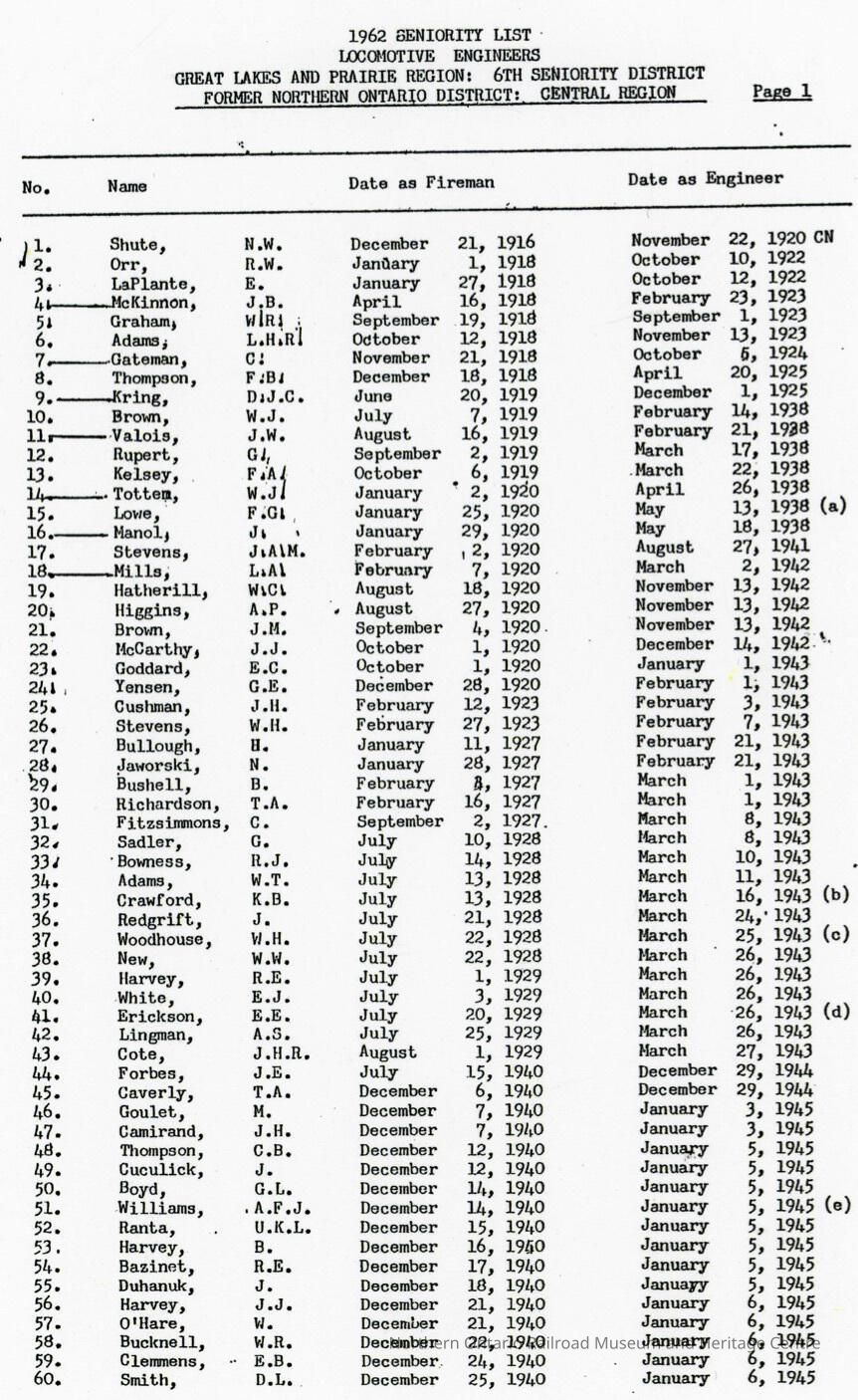1962 Seniority List, Locomotive Engineers, Great Lakes Region, 6th Seniority District.Collection