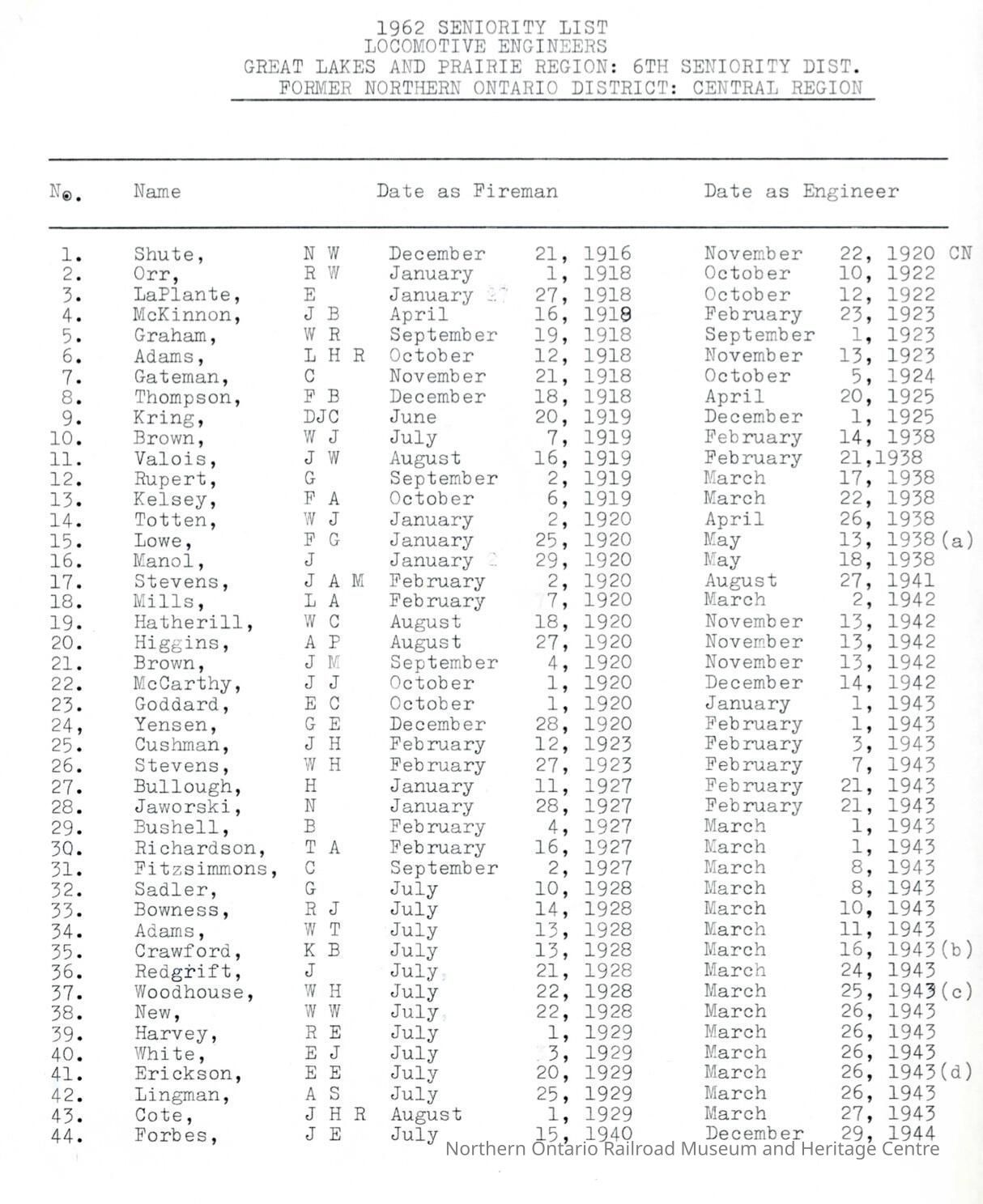 1962 Seniority List, Locomotive Enginers, Great Lakes and Prarie Region, 6th Seniority District Former Northern Ontario District, Central Region.Collection