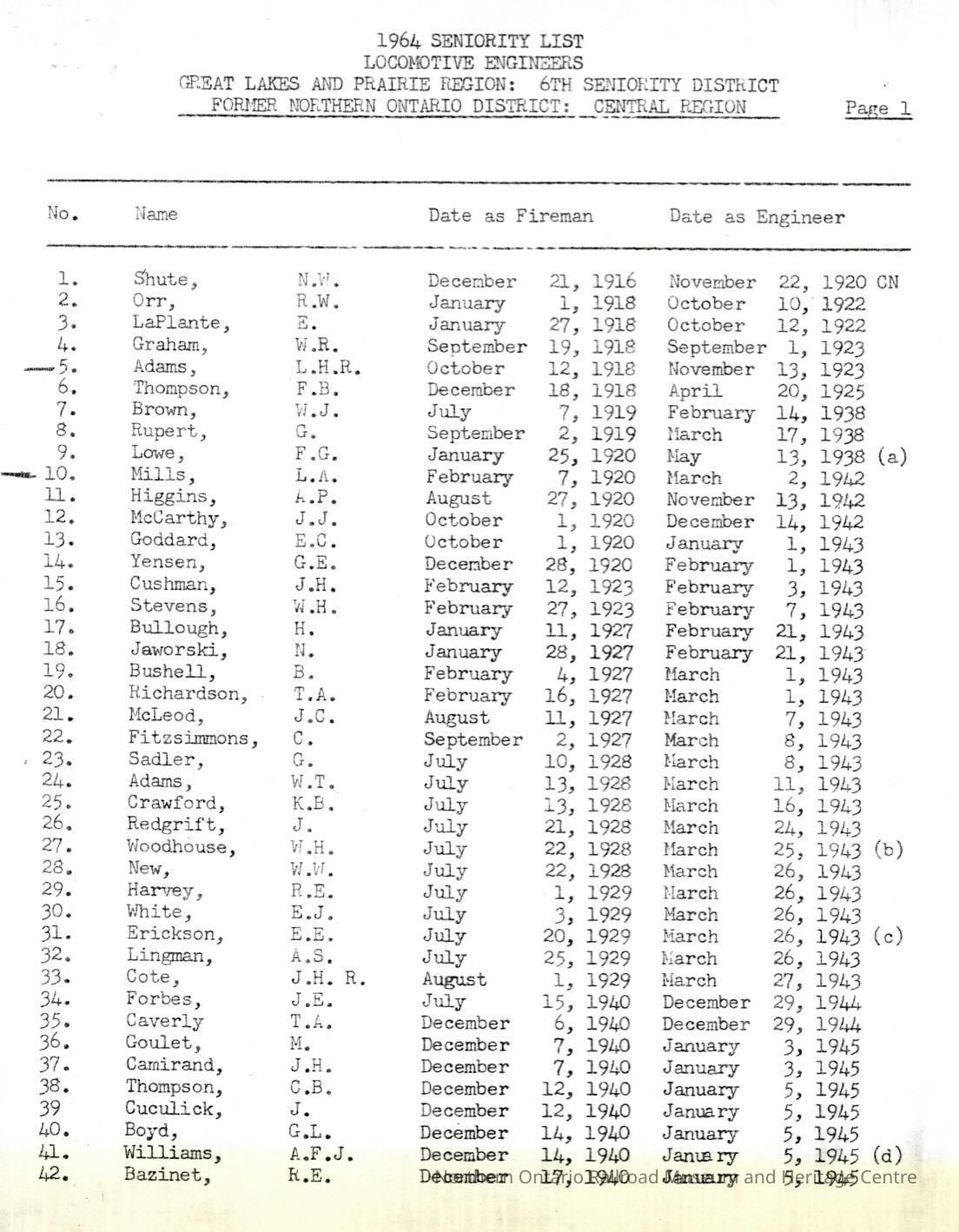 1964 Seniority List Locomotive Engineers Great Lakes and Prarie Region, 6th Seniority District, Former Northern Ontario District, Central Region.Collection