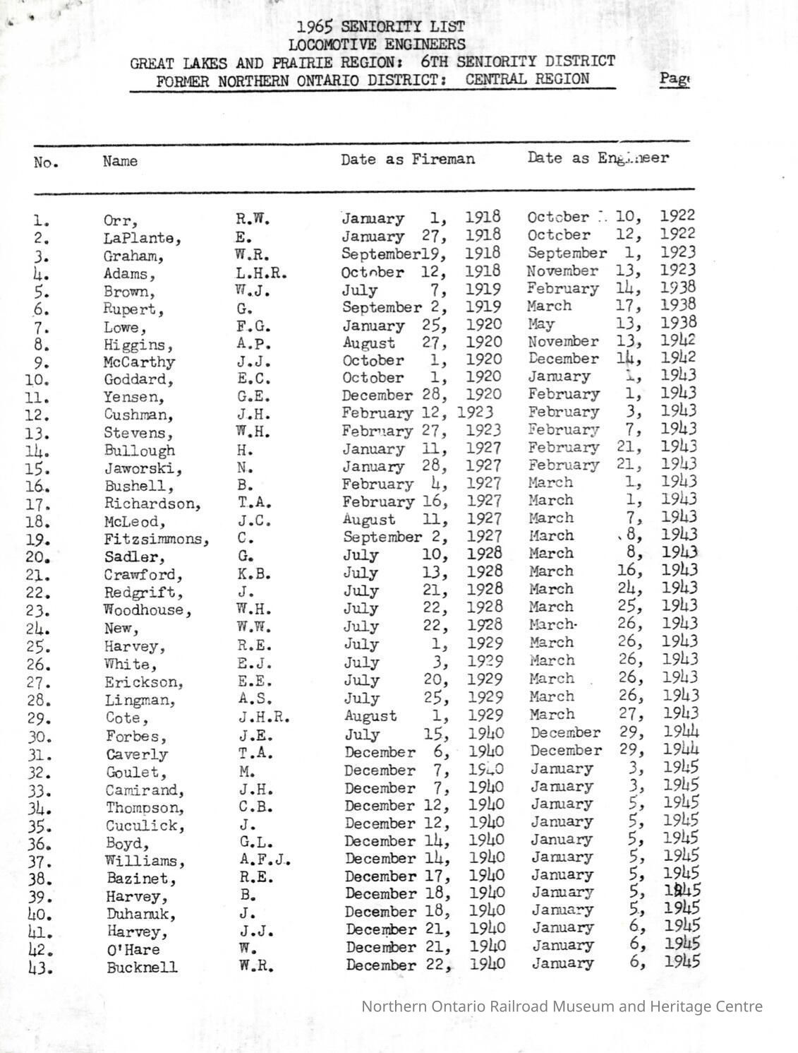 1965 Seniority List, Locomotive Engineers, Great Lakes and Prairie Region, 6th Seniority District, Former Northern Ontario District, Central Region.Collection