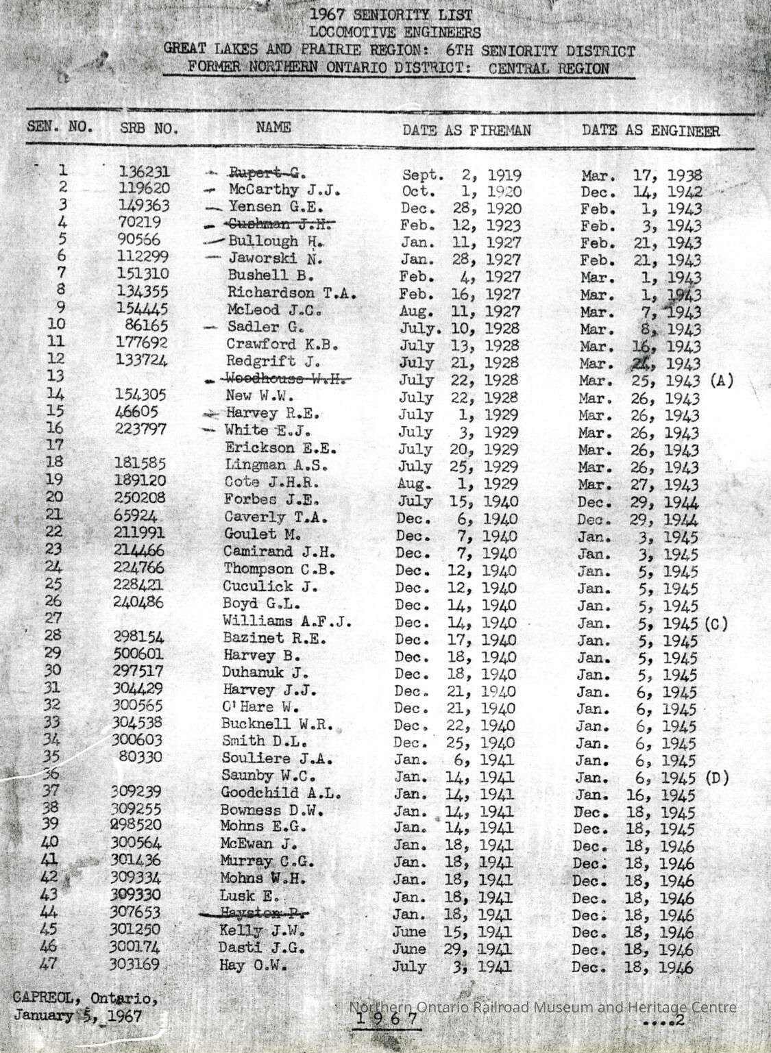 1967 Seniority List, Locomotive Engineers, Great Lakes and Prarie Region, 6th Seniority District, Former Northern Ontario District, Central Region.Collection