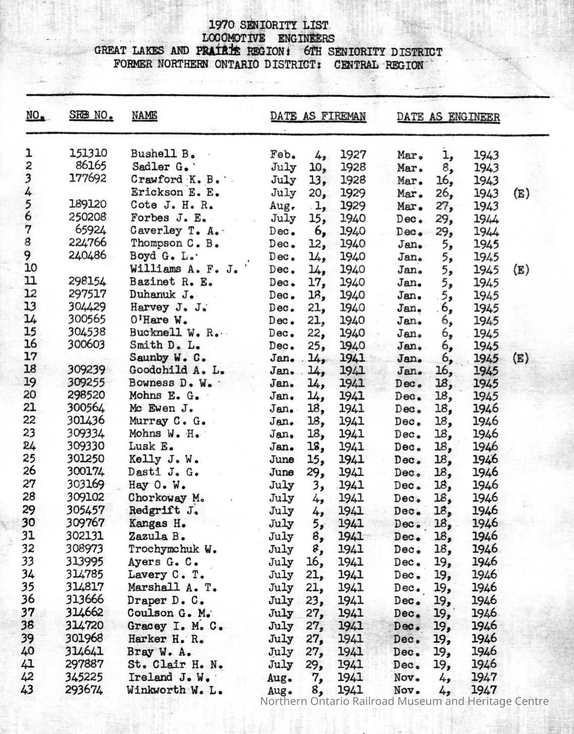 1970 Seniority List Locomotive Engineers Great Lakes and Prarie Region, 6th Seniority District Former Northern Ontario District, Central Region.Collection