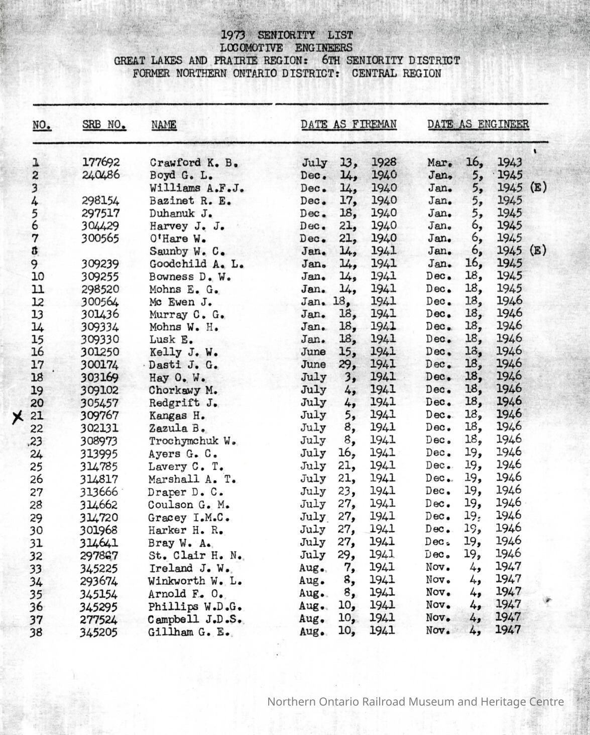 1973 Seniority List Locomotive Engineers, Great Lakes and Prarie Region, 6th Seniority District, Former Northern Ontario District, Central Region.Collection