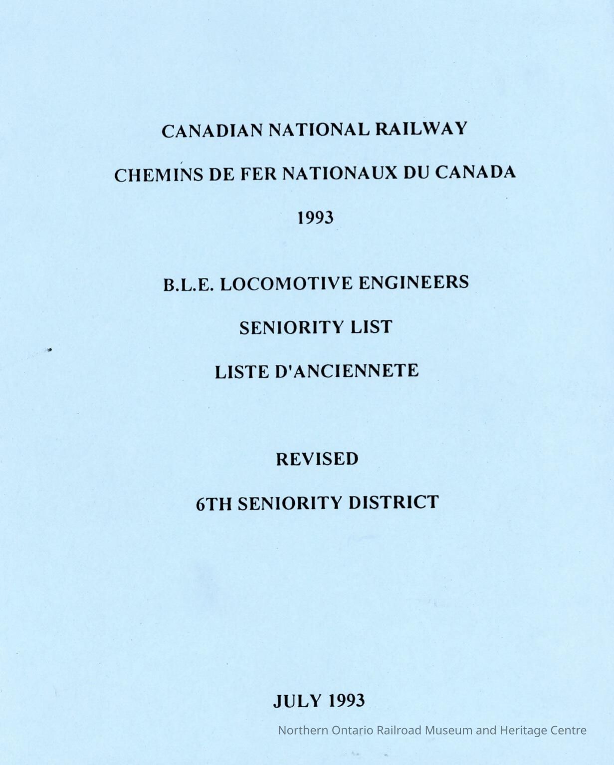 Canadian National Railway, 1993, BLE Locomotive Engineer's Seniority List, Revised, 6th Seniority List, July 1993.Collection