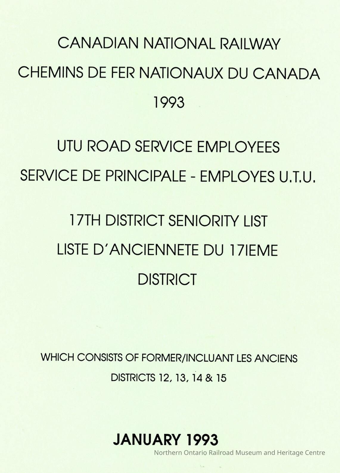 Canadian National Railway, 1993, UTU Road Service Employees, 17th District Seniority List, which consists of Former Districts 12, 13, 14 & 15, January 1993.Collection