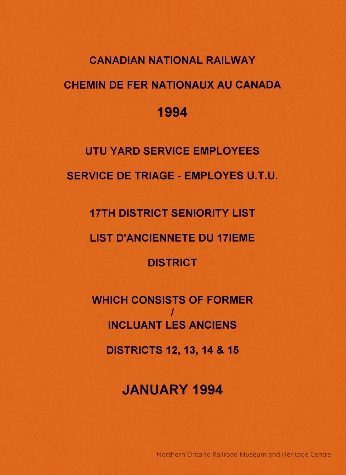 Canadian National Railway, 1994, UTU Yard Service Employees, 17th District Seniority List, which consists of Former Districts 12, 13, 14, & 15, January 1994.Collection