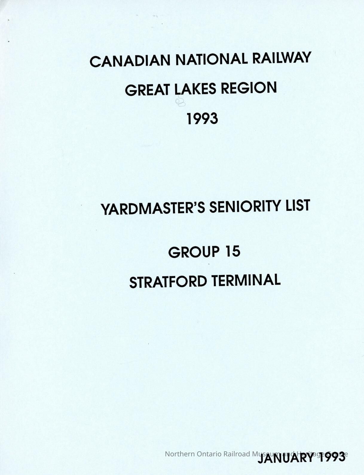 Canadian National Railway, Great Lakes Region, 1993, Yardmaster's Seniority List, Group 15, Stratford Terminal, January 1993.Collection