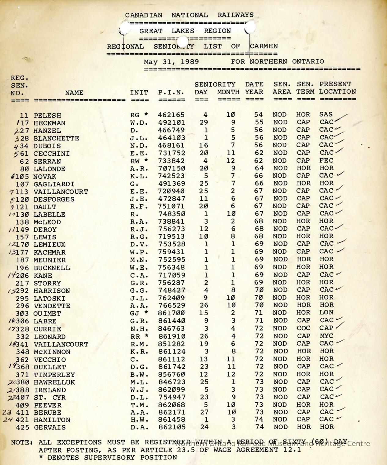 Canadian National Railways, Great Lakes Region, Regional Seniority List of Carmen, May 31, 1989 for Northern Ontario.Collection