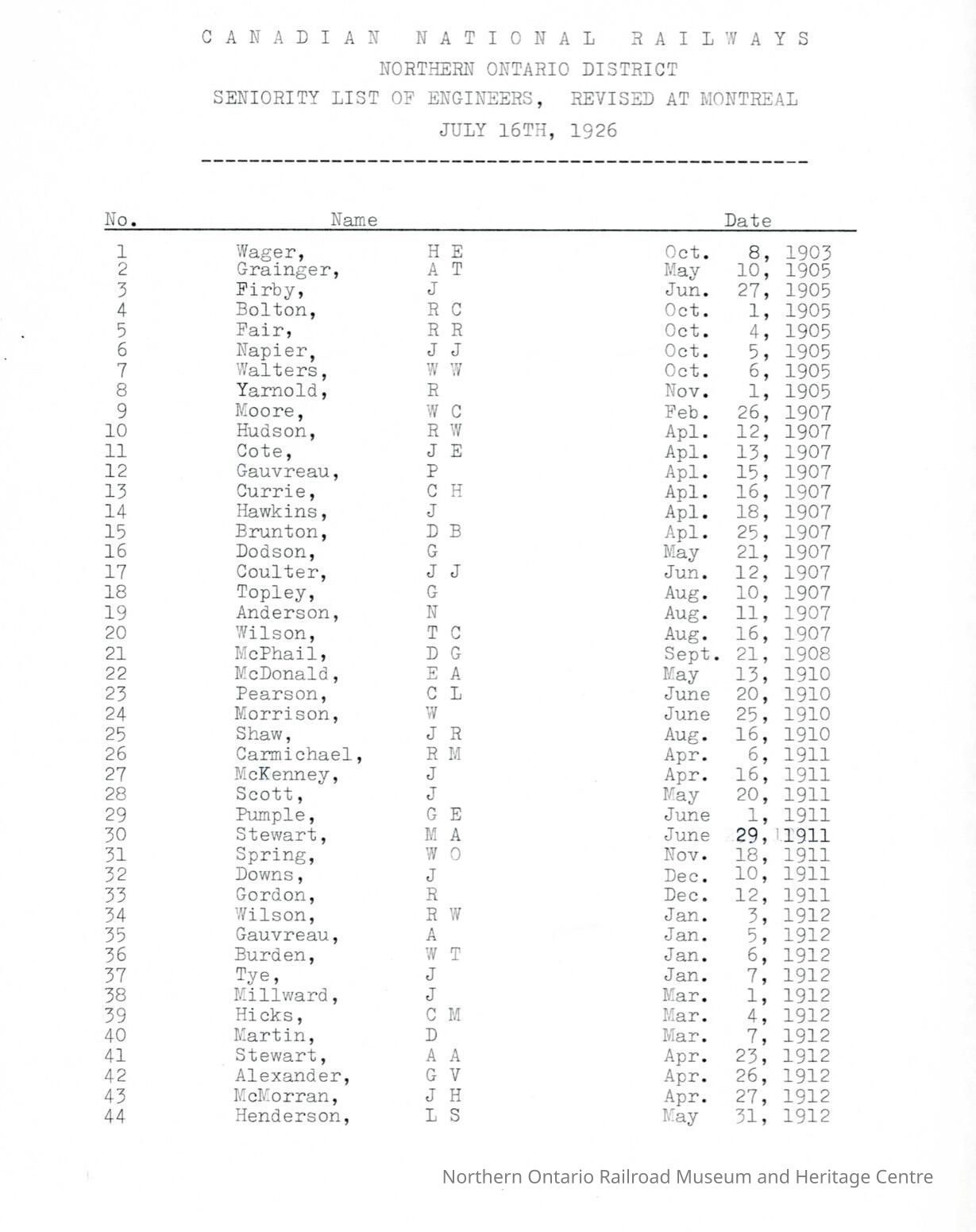 Canadian National Railways, Northern Ontario District, Seniority List of Engineers, Revised at Montreal, July 16, 1926.Collection
