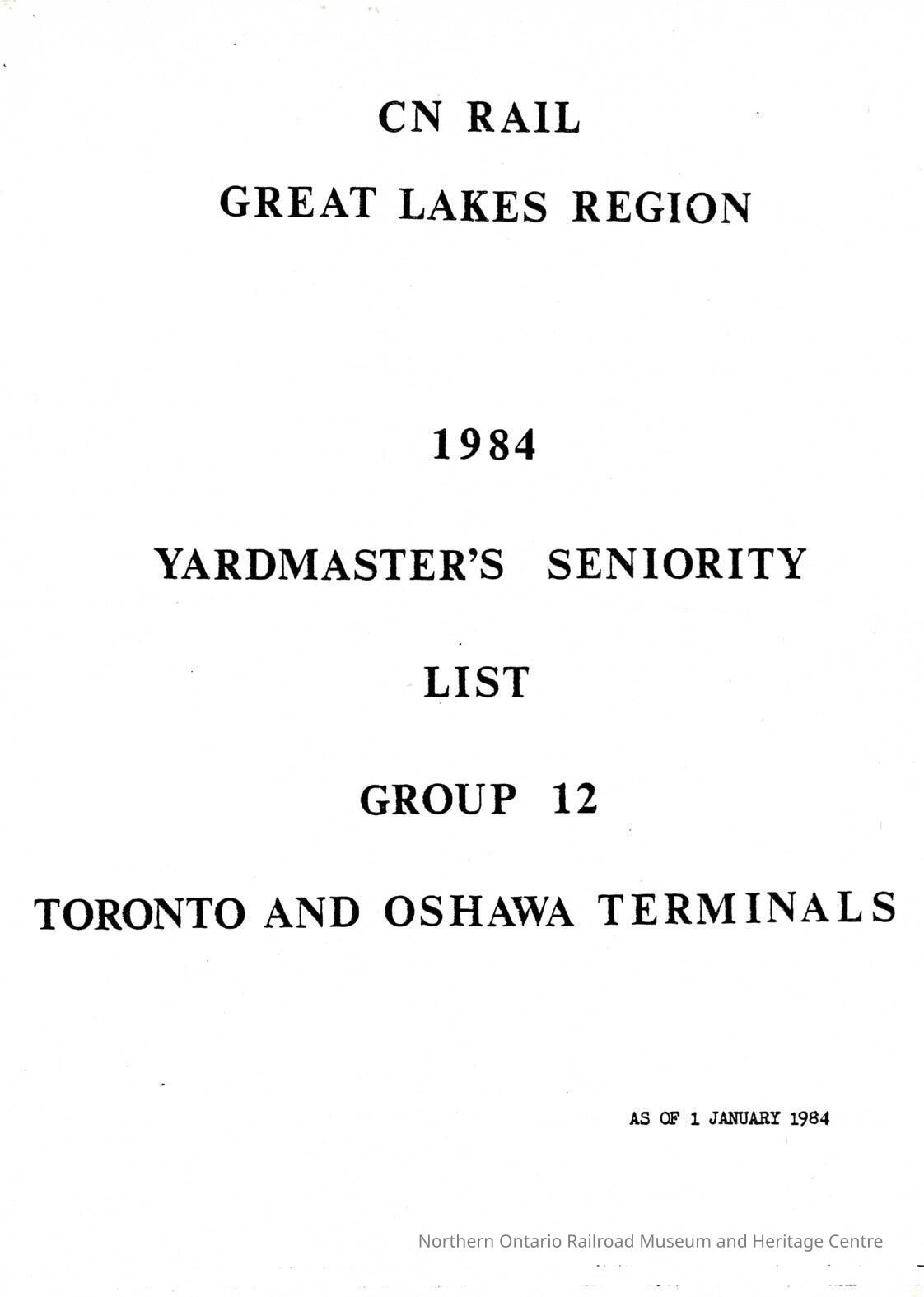 CN Rail, Great Lakes Region, 1984, Yardmaster's Seniority List, Group 12, Toronto and Oshawa Terminals.Collection