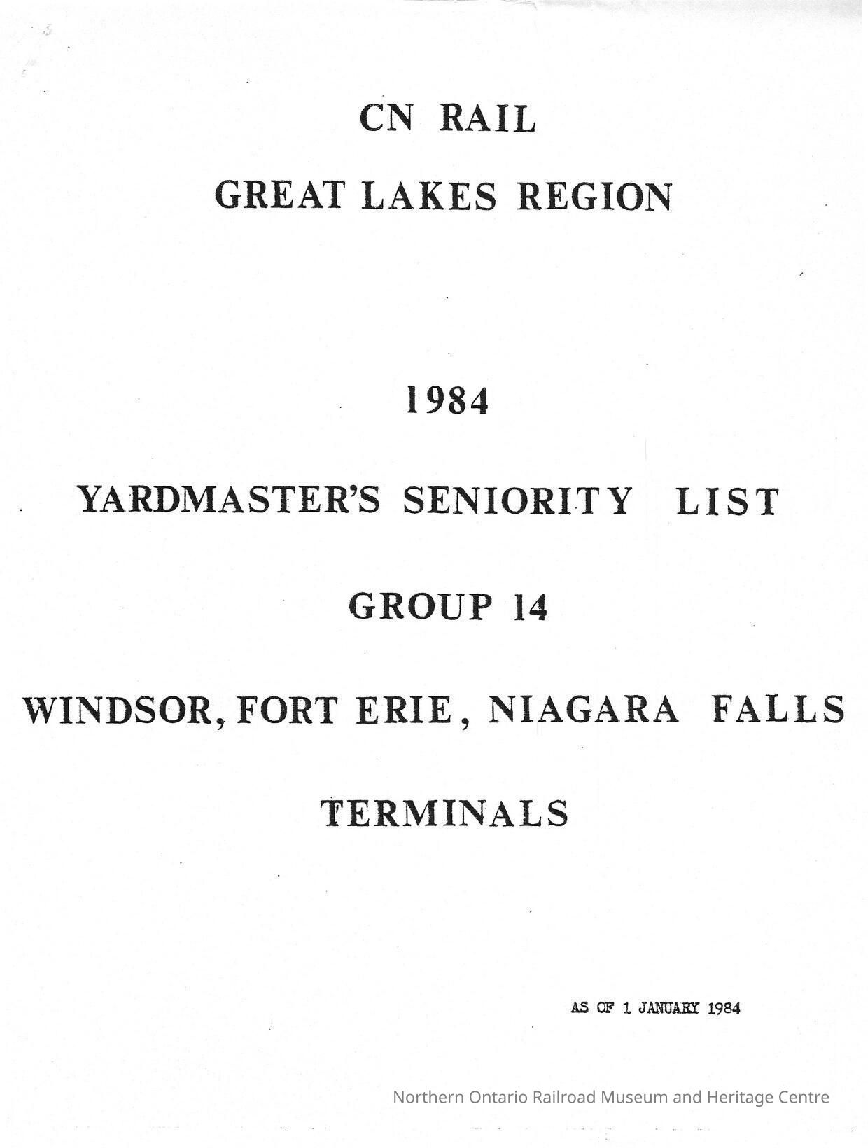 CN Rail, Great Lakes Region, 1984, Yardmaster's Seniority List, Group 14, Windsor, Fort Erie, Niagara Falls Terminals.Collection