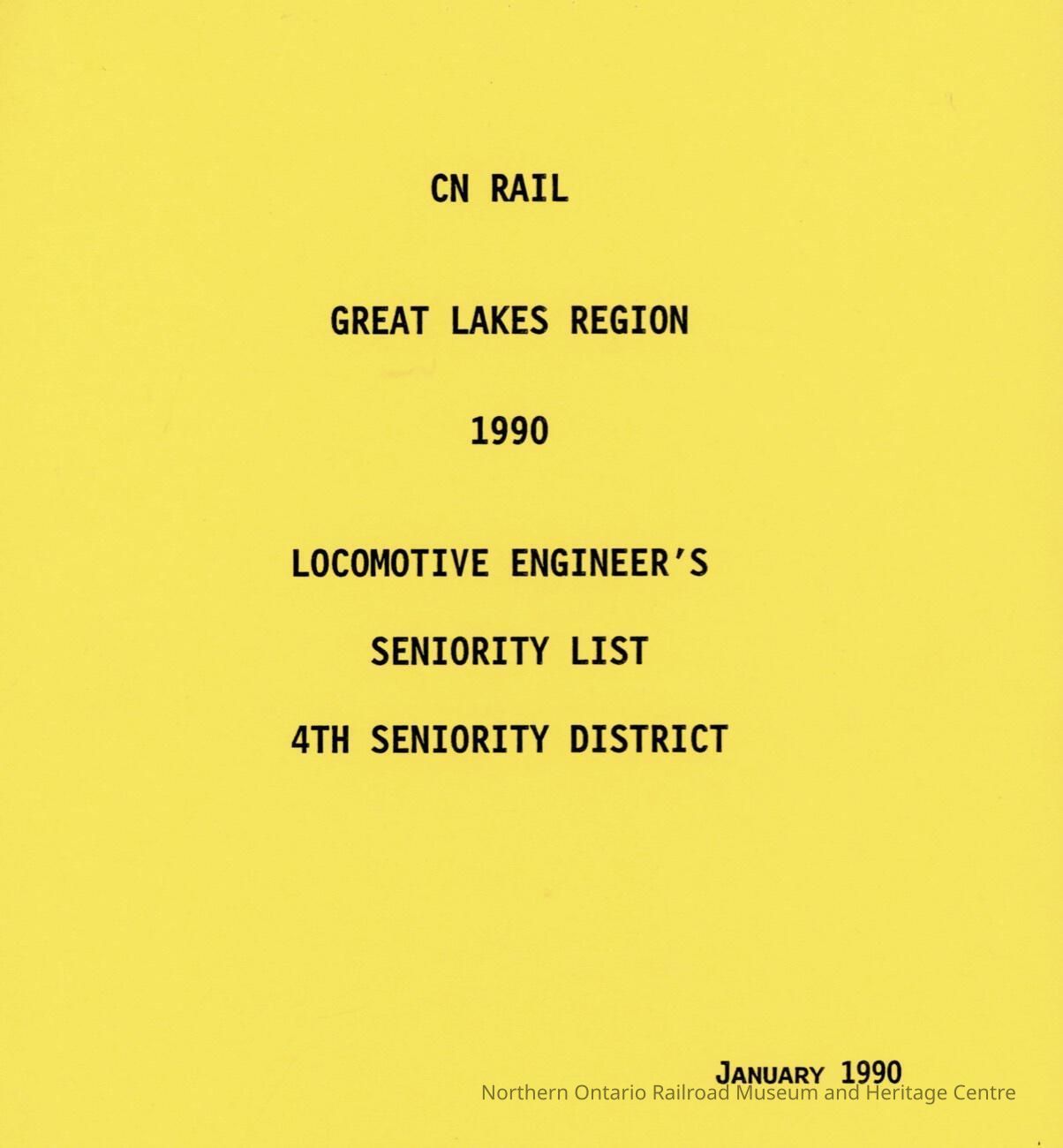 CN Rail, Great Lakes Region, 1990, Locomotive Engineer's Seniority List, 4th Seniority District, January 1990.Collection