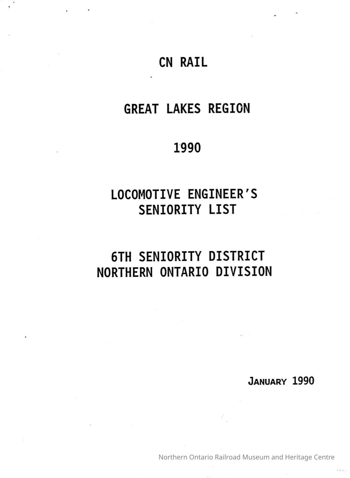 CN Rail, Great Lakes Region, 1990, Locomotive Engineer's Seniority List, 6th Seniority District Northern Ontario Division.Collection