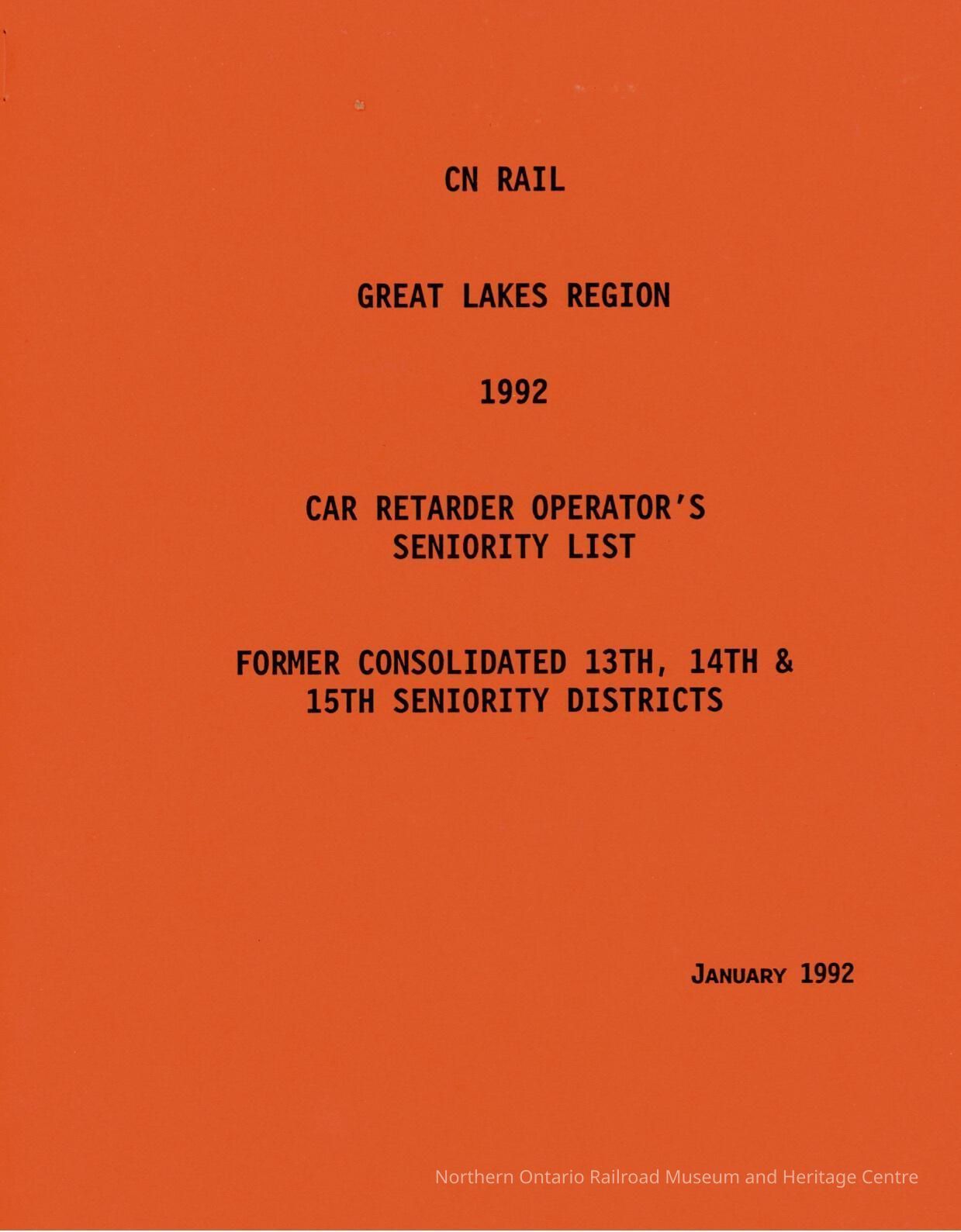 CN Rail, Great Lakes Region, 1992, Car Retarder Operator's Seniority List, Former Consolidated 13th, 14th & 15th Seniority Districts, January 1992.Collection