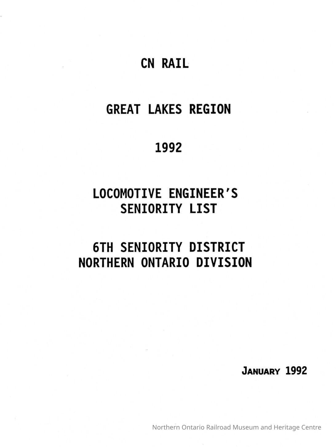 CN Rail, Great Lakes Region, 1992, Locomotive Engineer's Seniority List 6th Seniority District Northern Ontario Division.Collection
