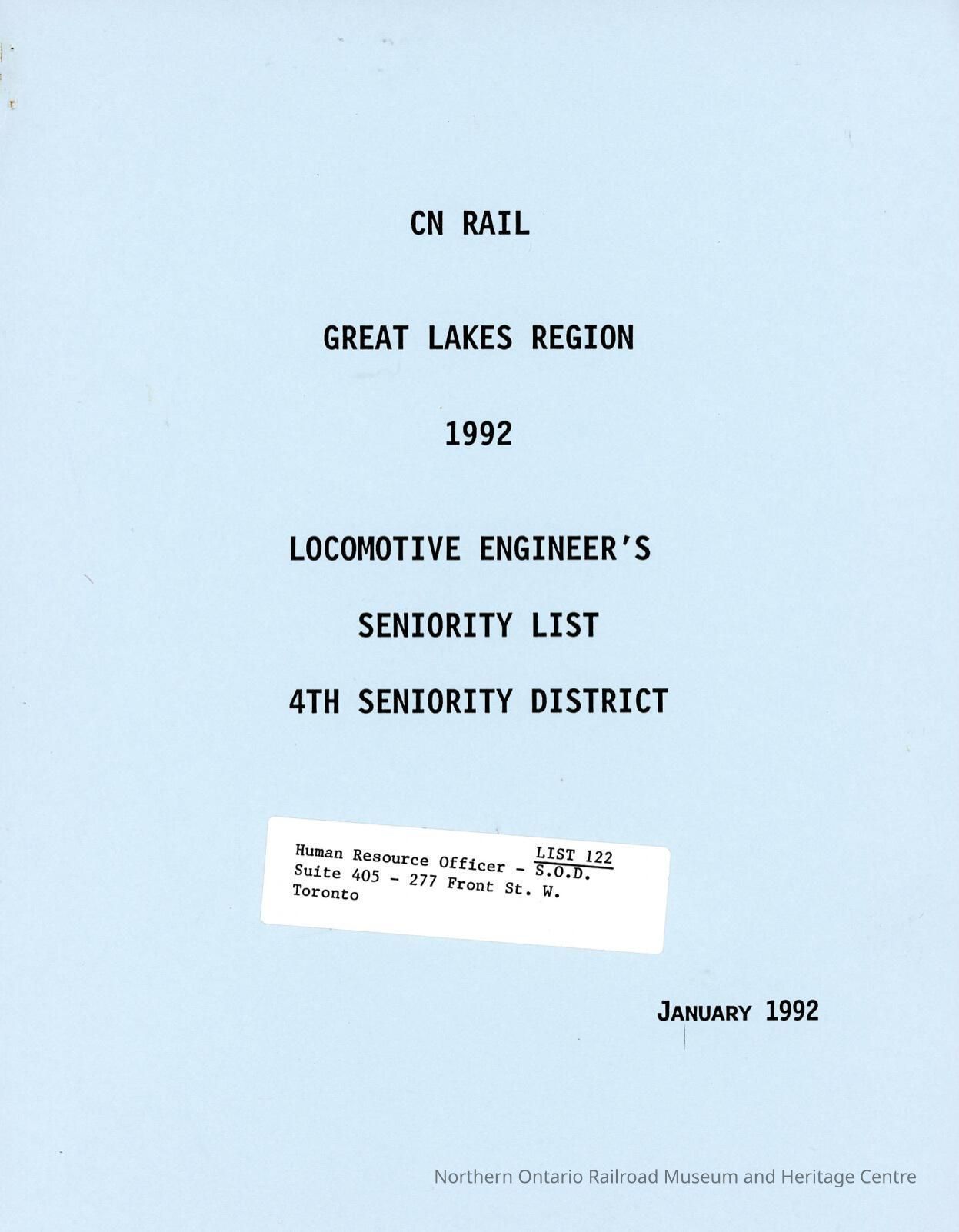 CN Rail, Great Lakes Region, 1992, Locomotive Engineer's Seniority List, 4th Seniority District, January 1992.Collection