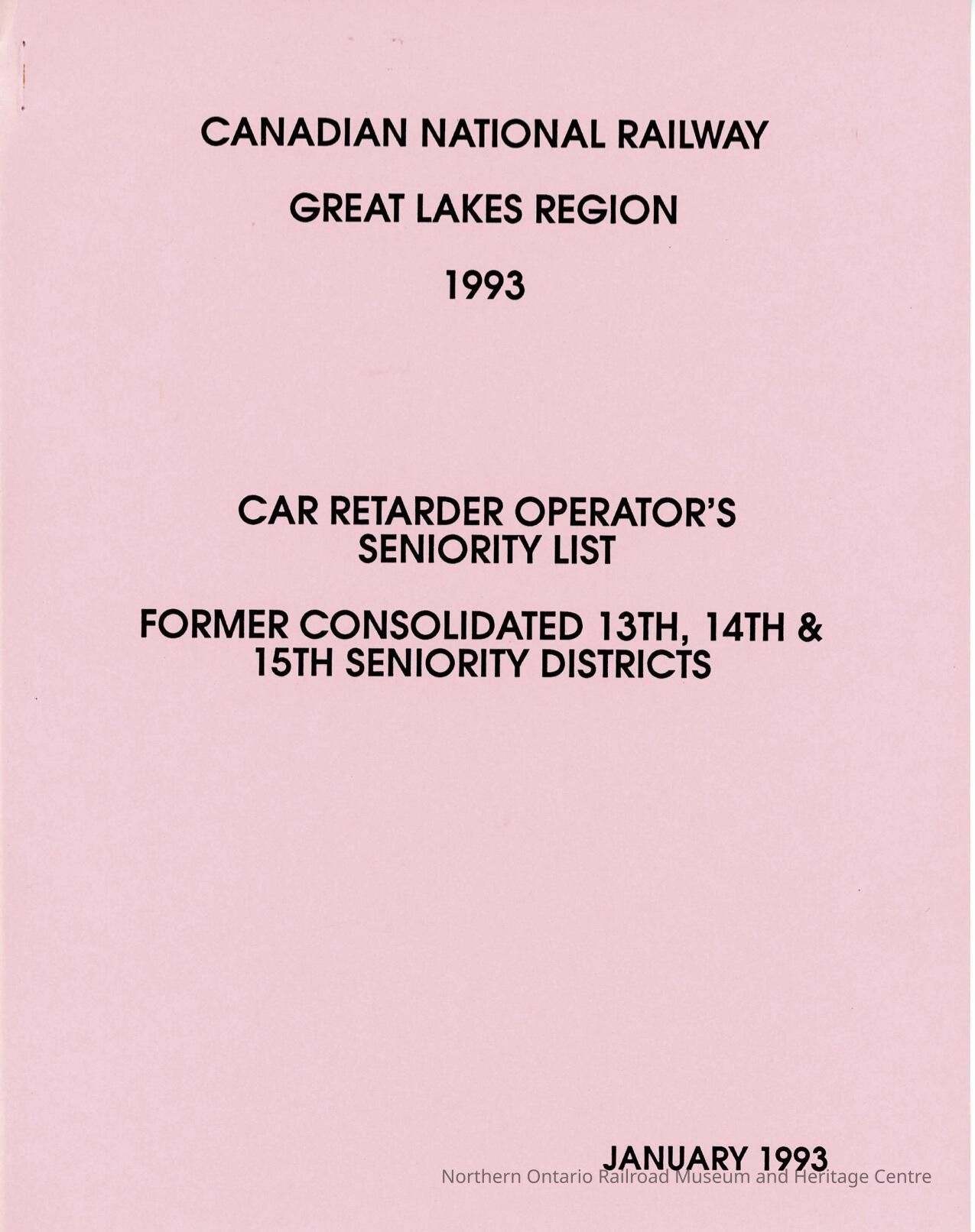 CN Rail, Great Lakes Region, 1993, Car Retarder Operator's Seniority List, Former Consolidated 13th, 14th and 15th Seniority Districts, January 1993.Collection