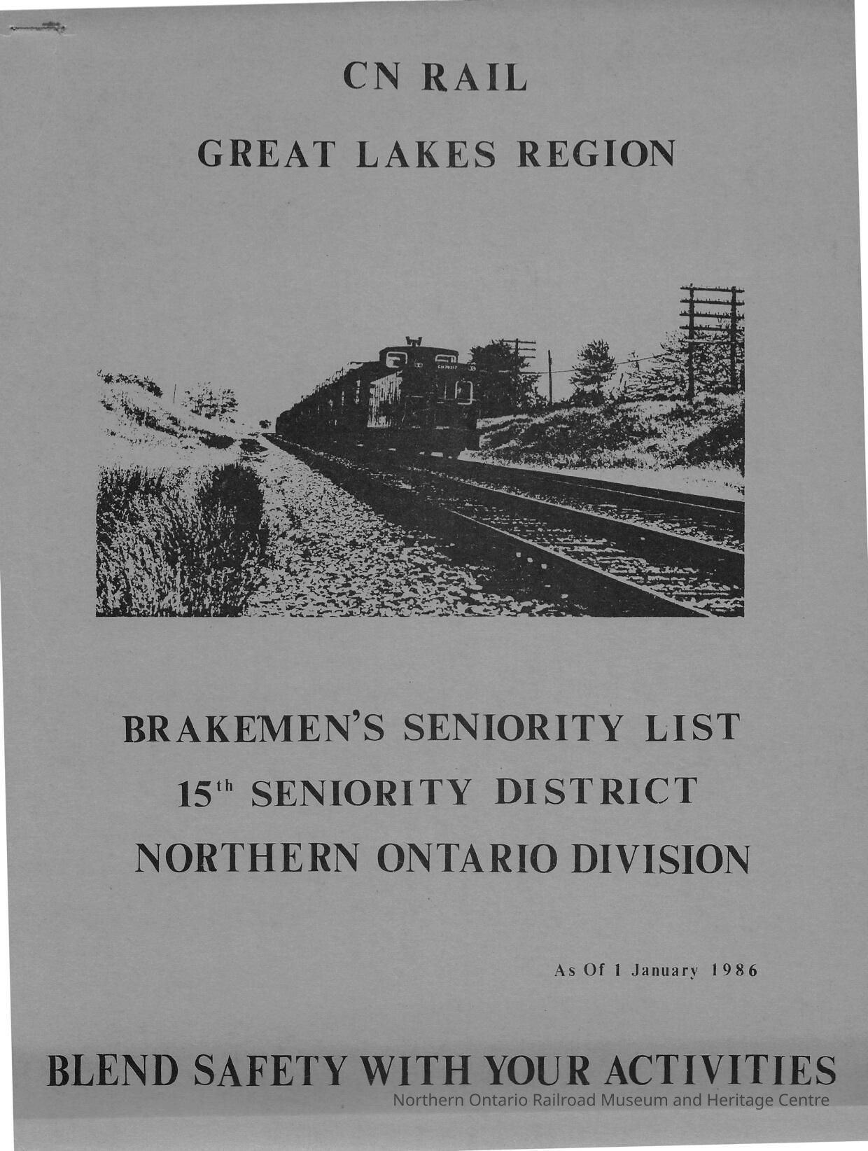 CN Rail, Great Lakes Region, Brakemen's Seniority List, 15th Seniority District Northern Ontario Division, 1 January 1986.Collection