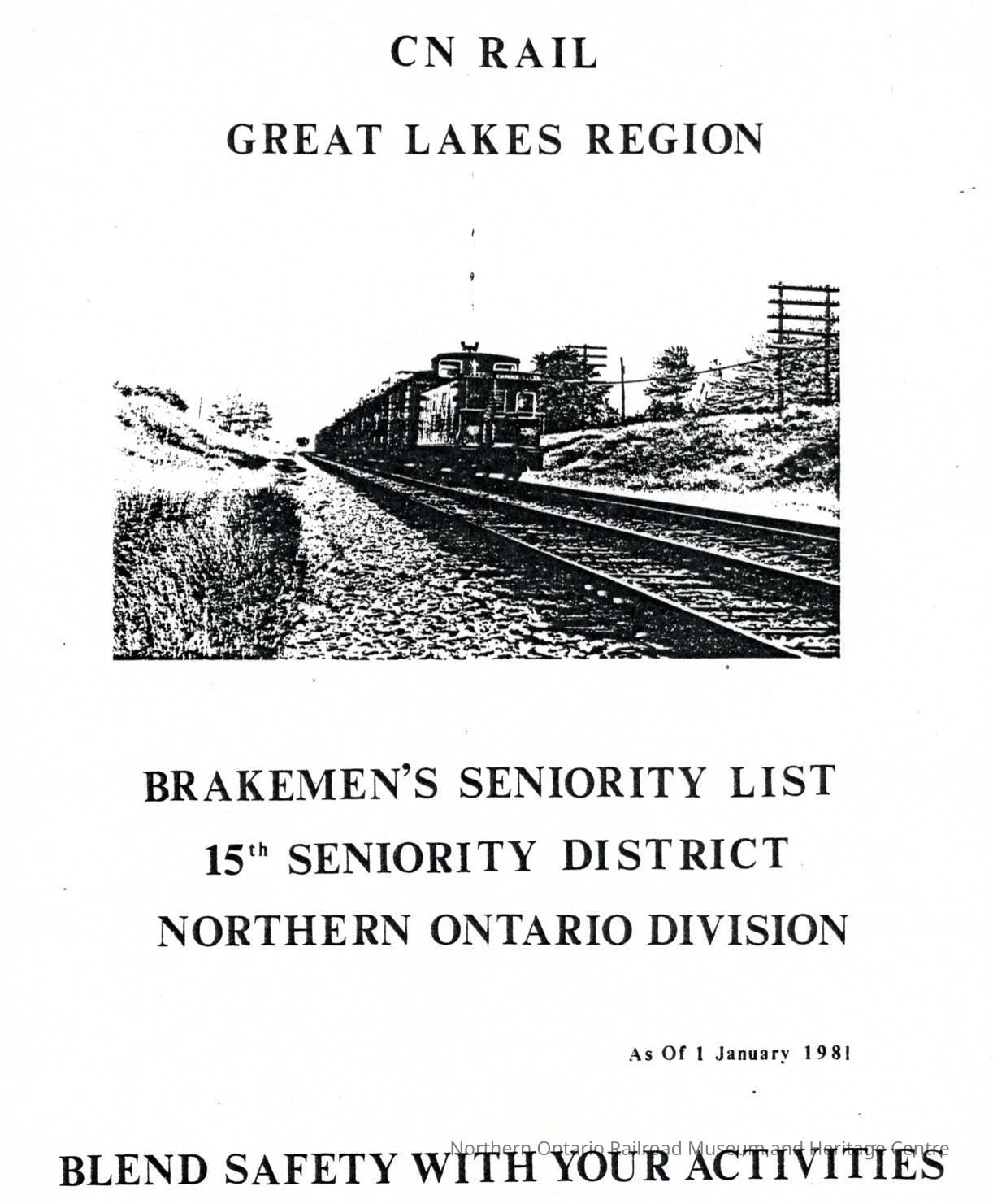 CN Rail, Great Lakes Region, Brakemen's Seniority List, 15th Seniority District, Northern Ontario Division, 1 January 1981.Collection