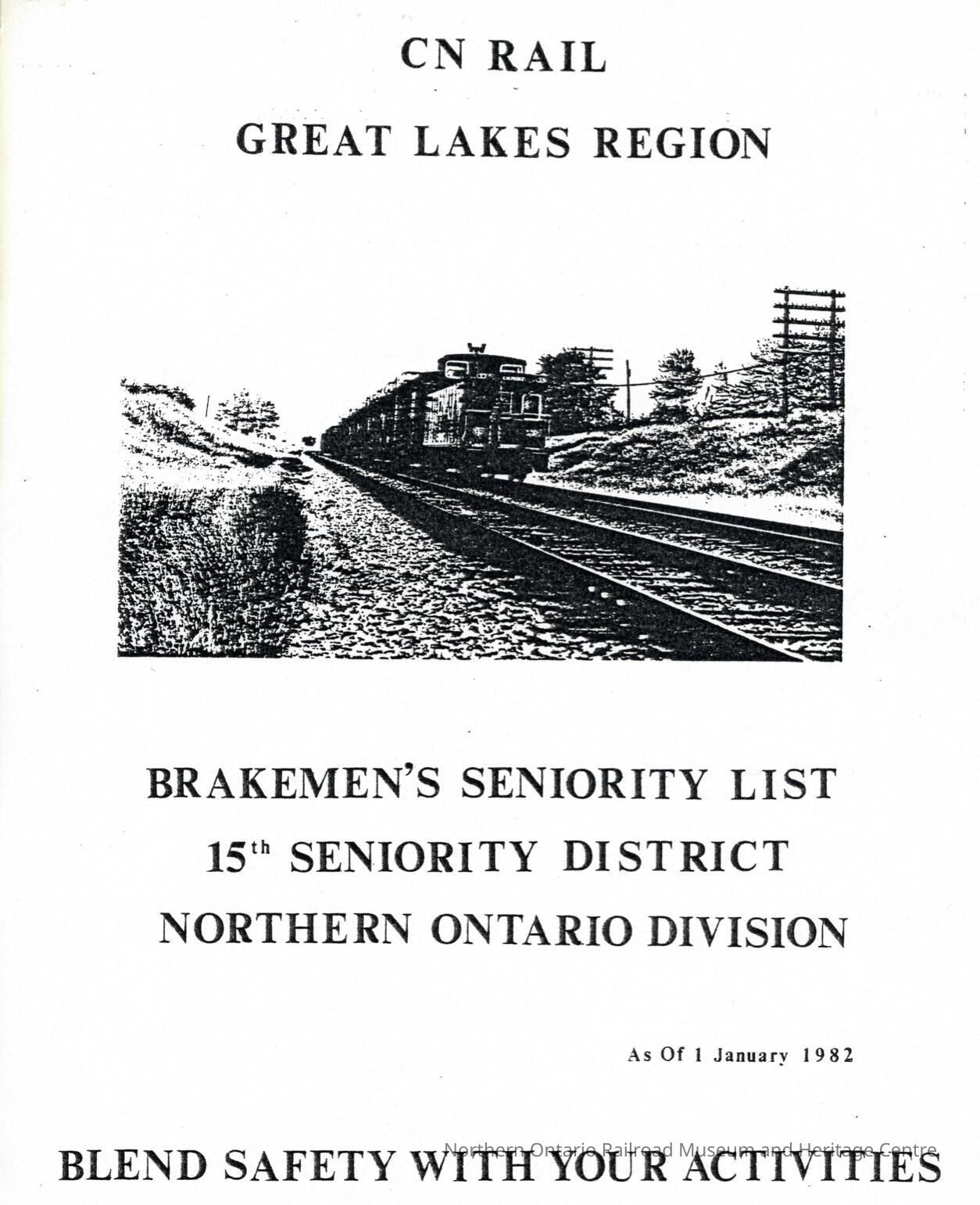 CN Rail, Great Lakes Region, Brakemen's Seniority List, 15th Seniority District, Northern Ontario Division, as of 1 January 1982.Collection