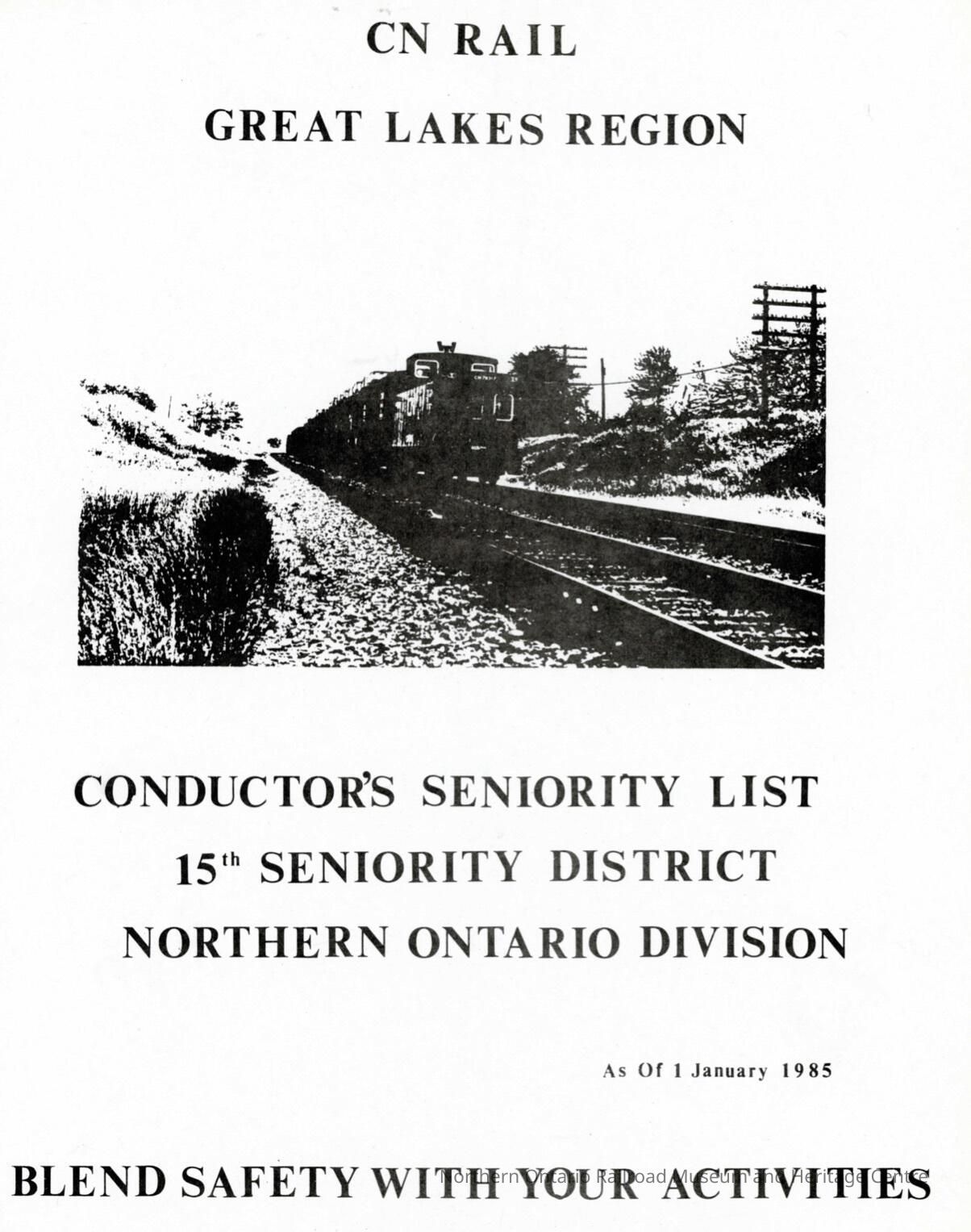 CN Rail, Great Lakes Region, Conductor's Seniority List, 15th Seniority District, Northern Ontario Division, 1 January 1985.Collection