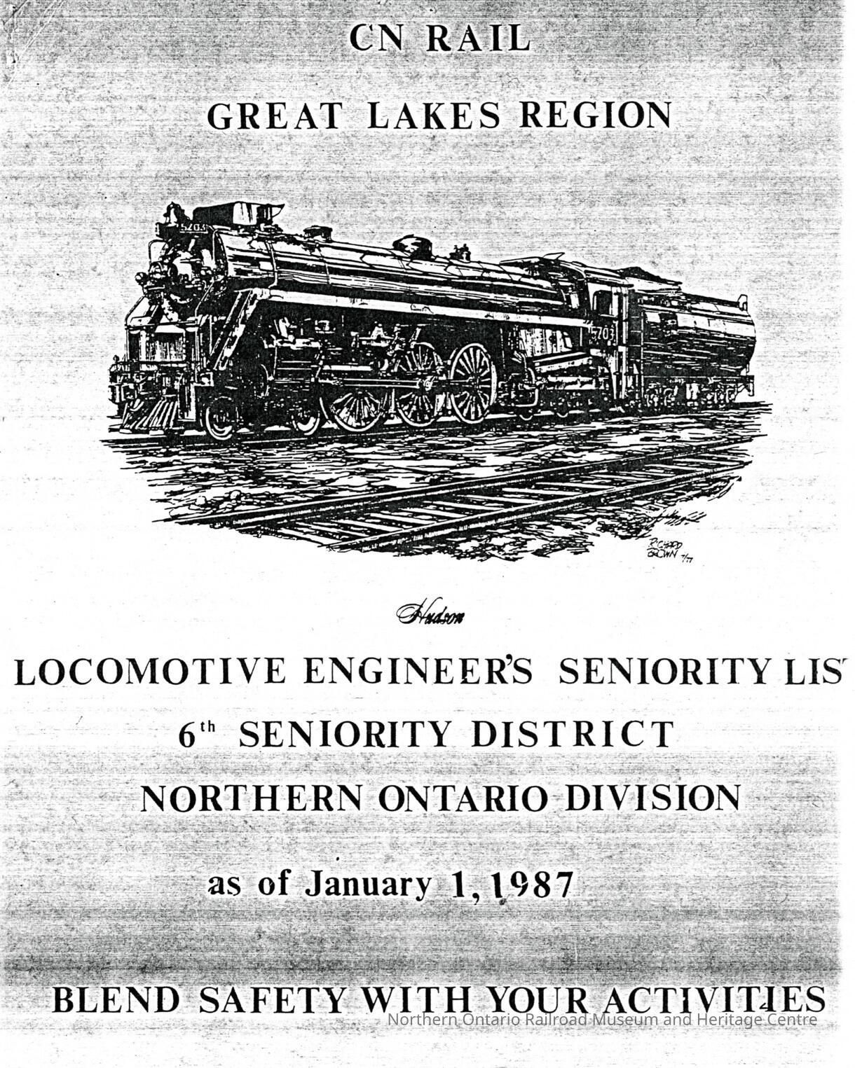 CN Rail, Great Lakes Region, Locomotive Engineer's Seniority List, 6th Seniority District, Northern Ontario Division, as of January 1, 1987.Collection