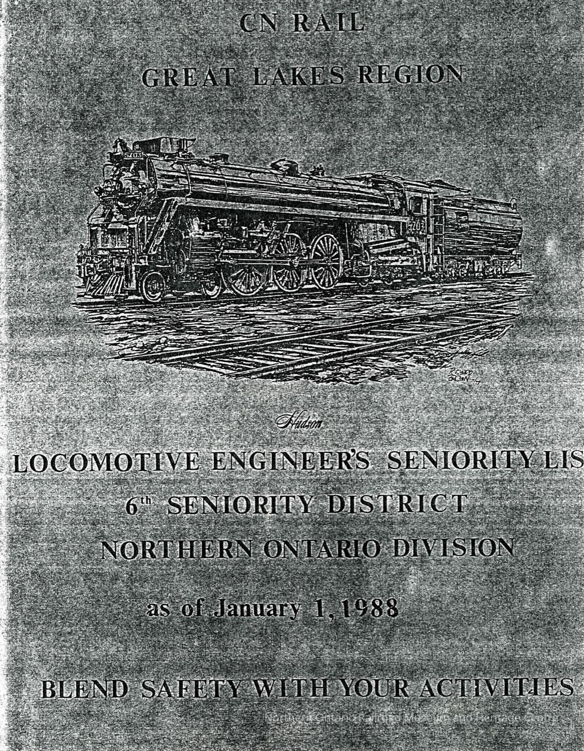 CN Rail, Great Lakes Region, Locomotive Engineer's Seniority List, 6th Seniority District, Northern Ontario Division, as of January 1988.Collection