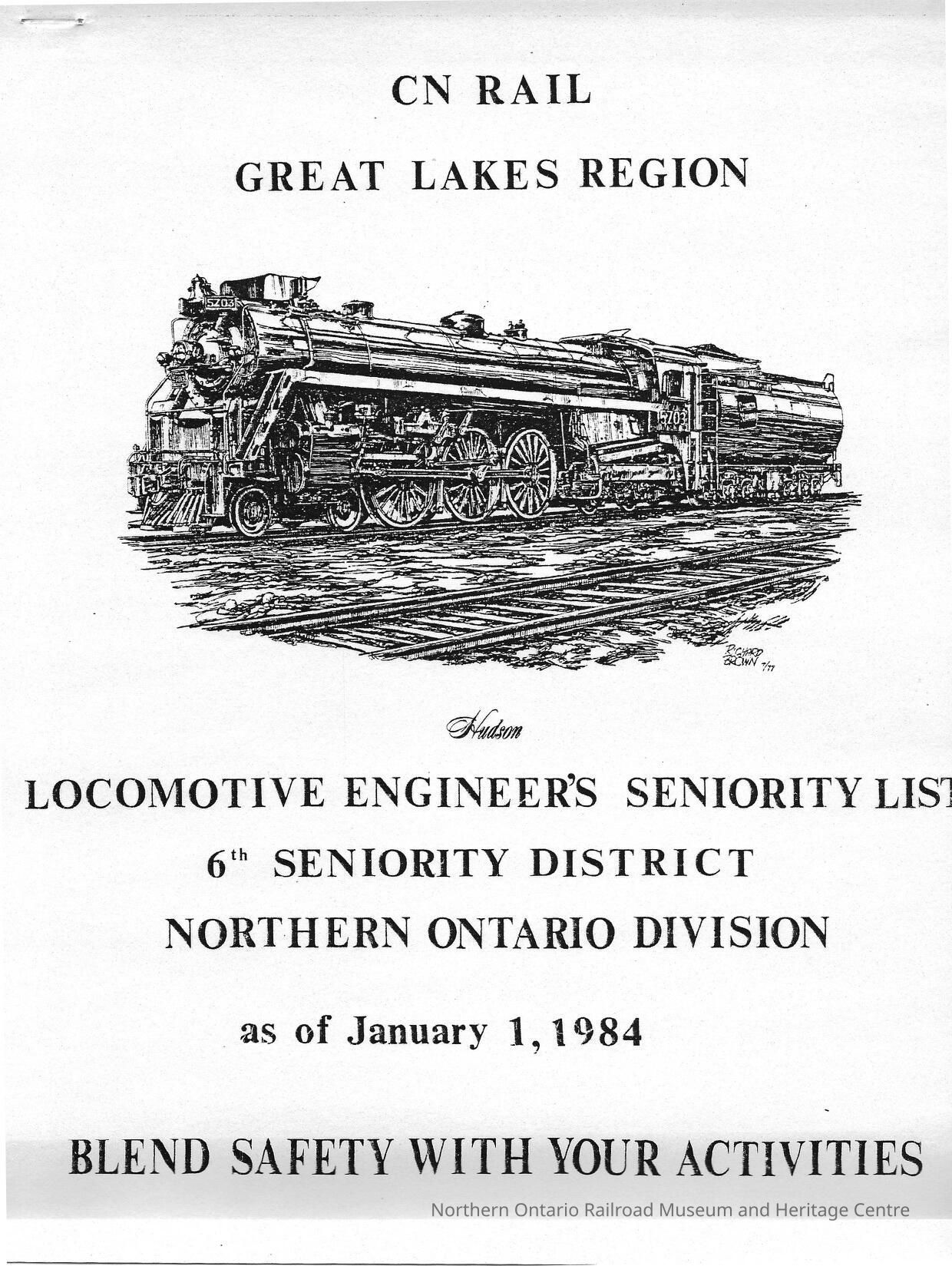 CN Rail, Great Lakes Region, Locomotive Engineer's Seniority List, 6th Seniority District, Northern Ontario Division, January 1, 1984.Collection
