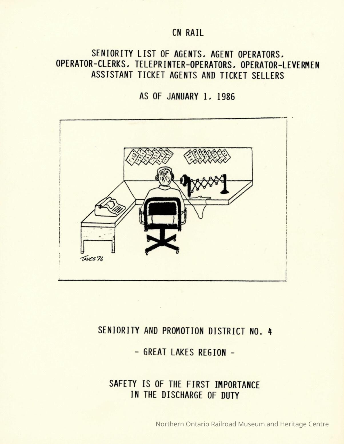 CN Rail, Great Lakes Region, Seniority List of Agents, Agent Operators, Operator-Clerks, Teleprinter-Operators, Operator-Levermen, Assistant Ticket Agents and Ticket Sellers, January 1 1986.Collection